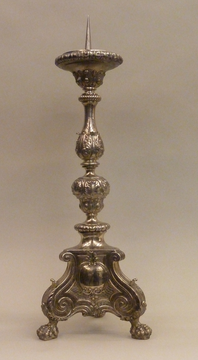 Kandelaar op drie klauwpoten met drie blanco cartouches. In een van de cartouches zijn resten van een gravering aanwezig, die lijken op een schild.