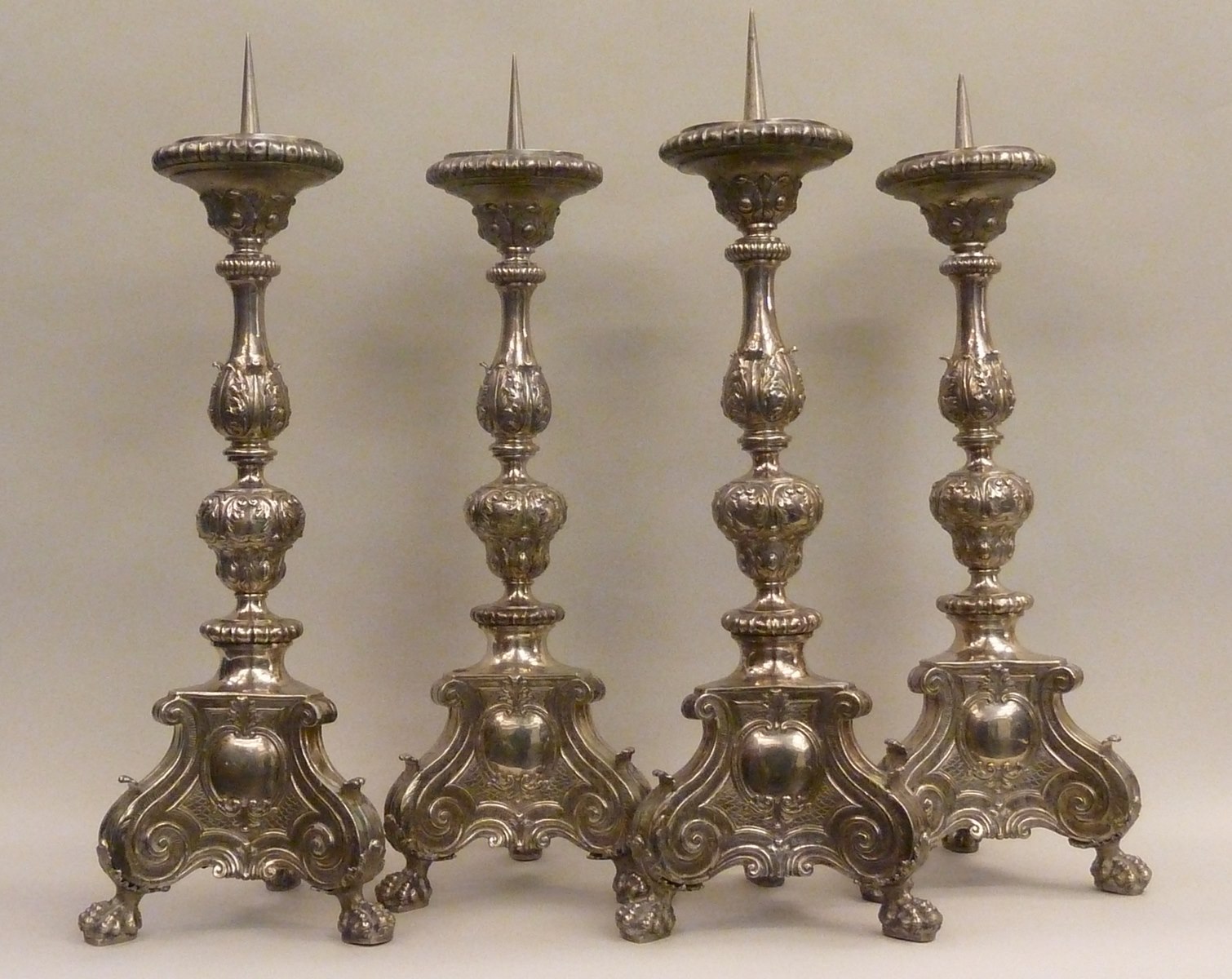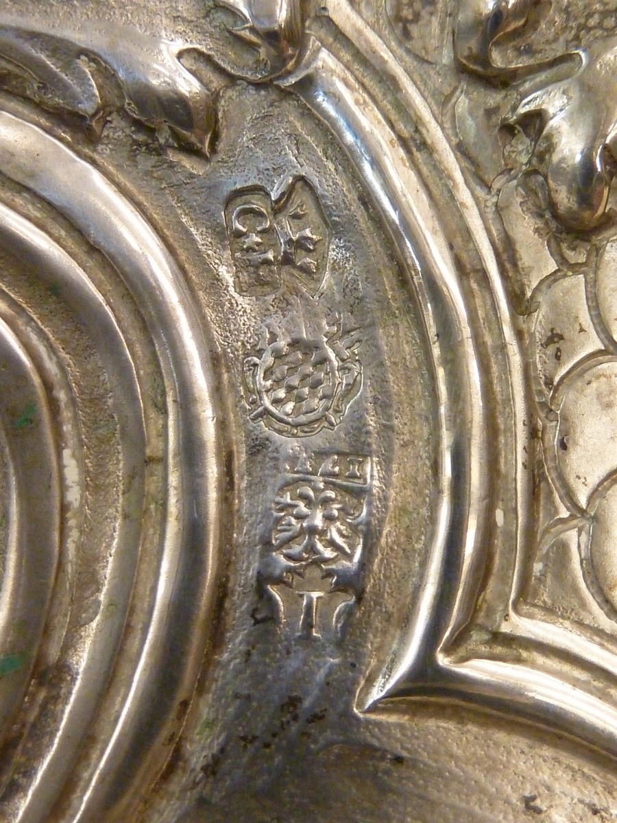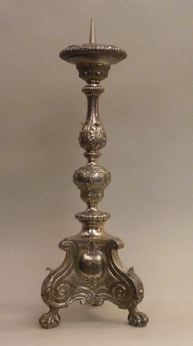 Kandelaar op drie klauwpoten met drie blanco cartouches. In een van de cartouches zijn resten van een gravering aanwezig, die lijken op een schild.