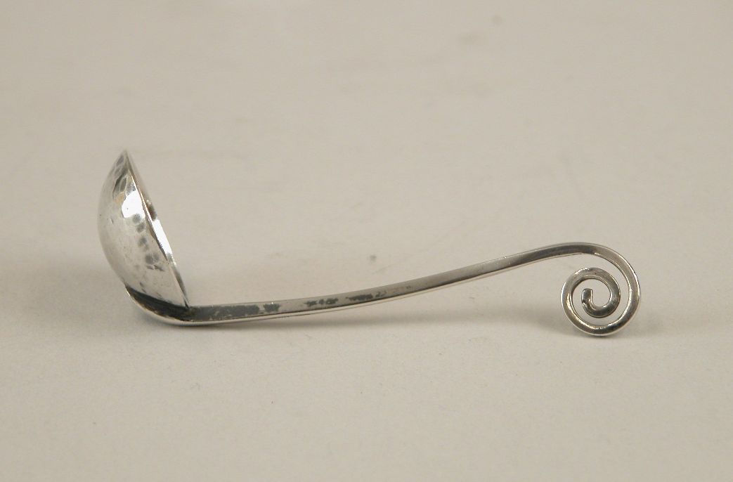 Kelklepeltje met ronde bak en steel eindigend in krul