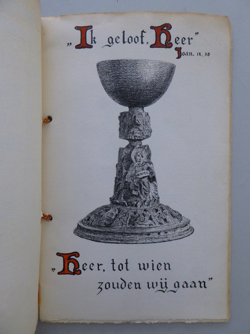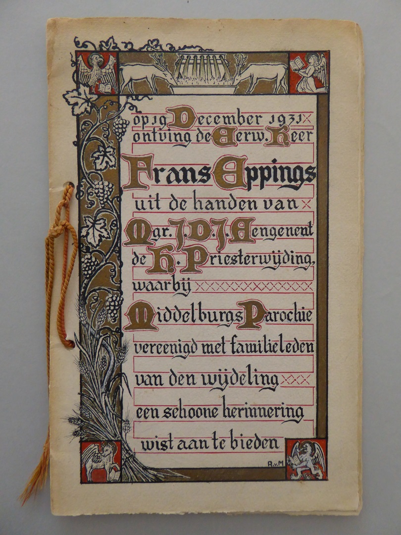 Gekalligrafeerde lijst met namen van aanbieders van kelk, pateen en lepeltje StCC m111a t/m c aan Frans Eppings bij priesterwijding