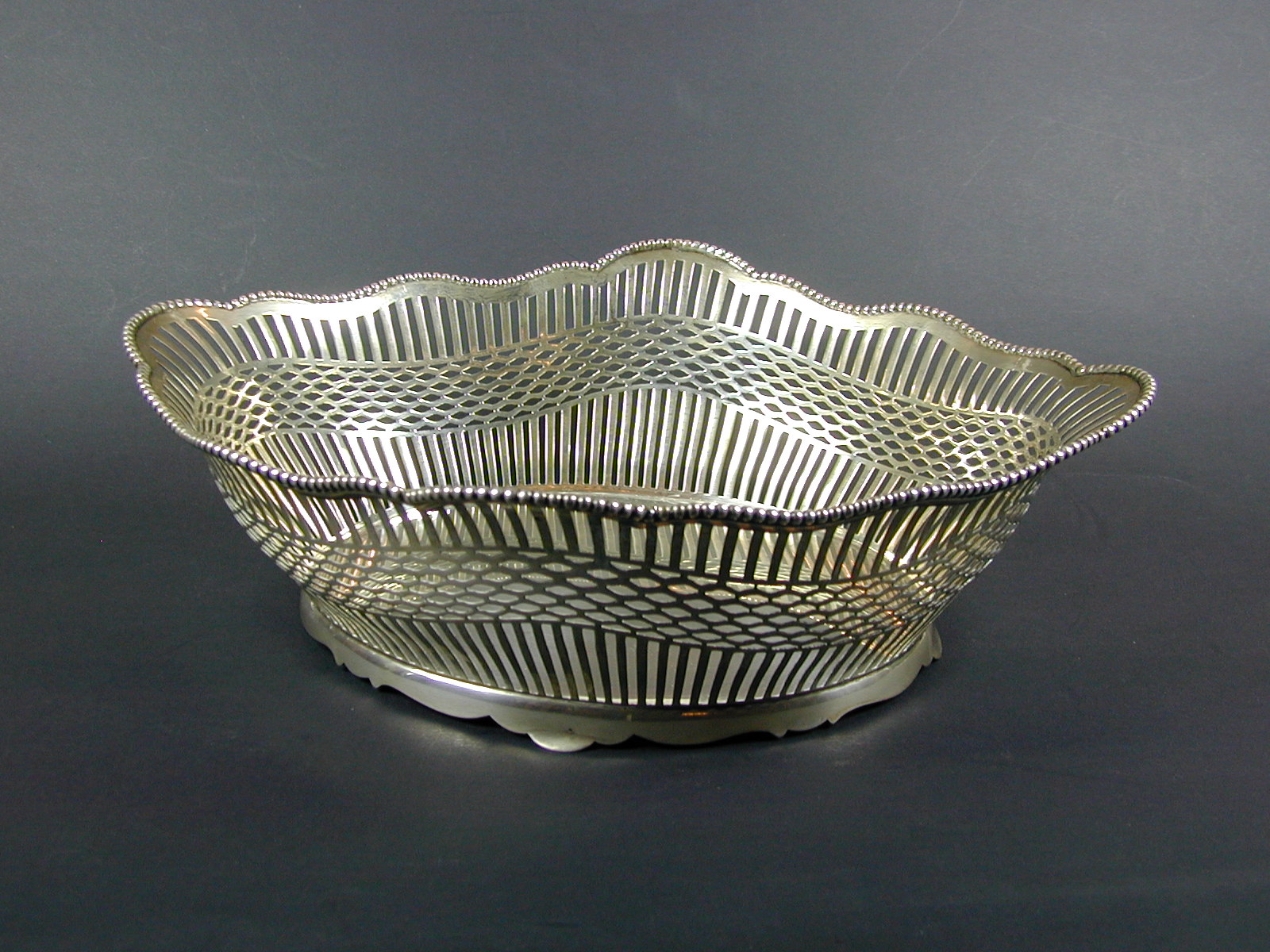 Opengewerkte ovale zilveren broodmand met parelrand, vanaf ca. 1960 gebruikt als hostieschaal