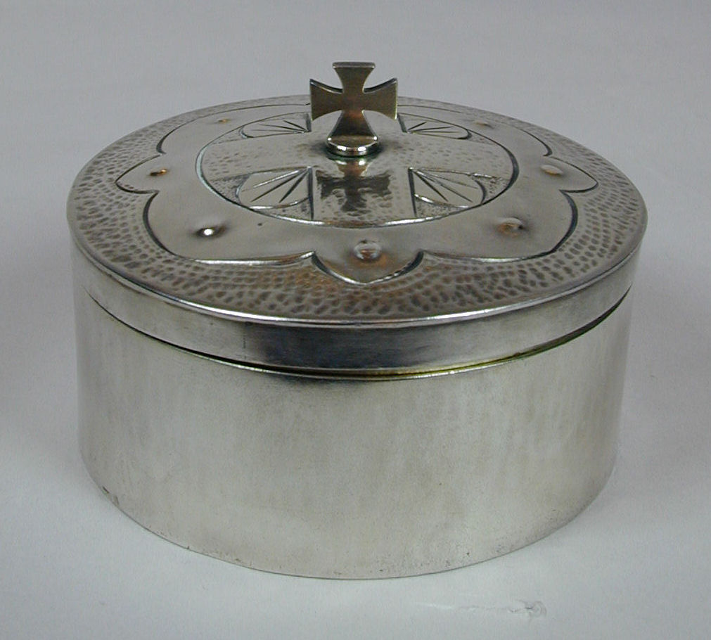 Pyxis met scharnierend deksel waarop o.a. gehamerd kruis, met kruisje als bekroning