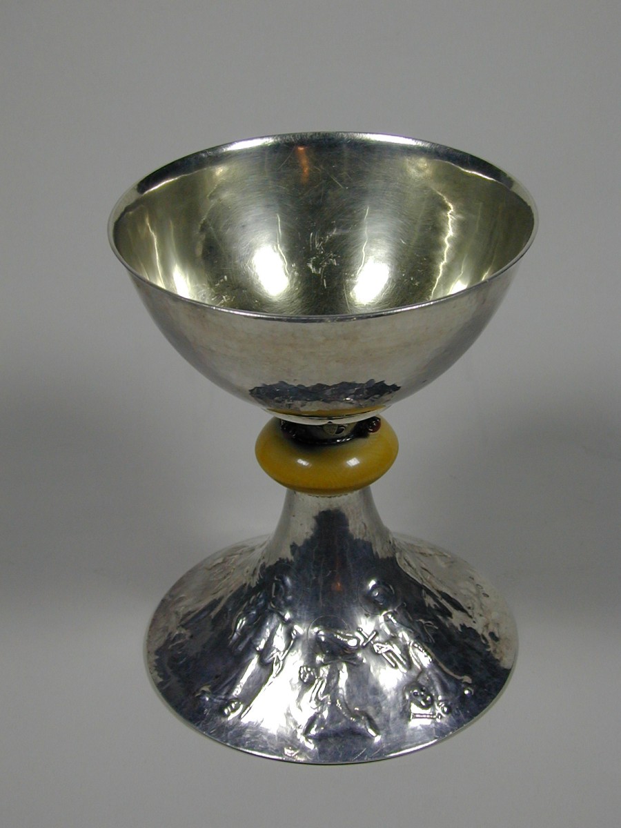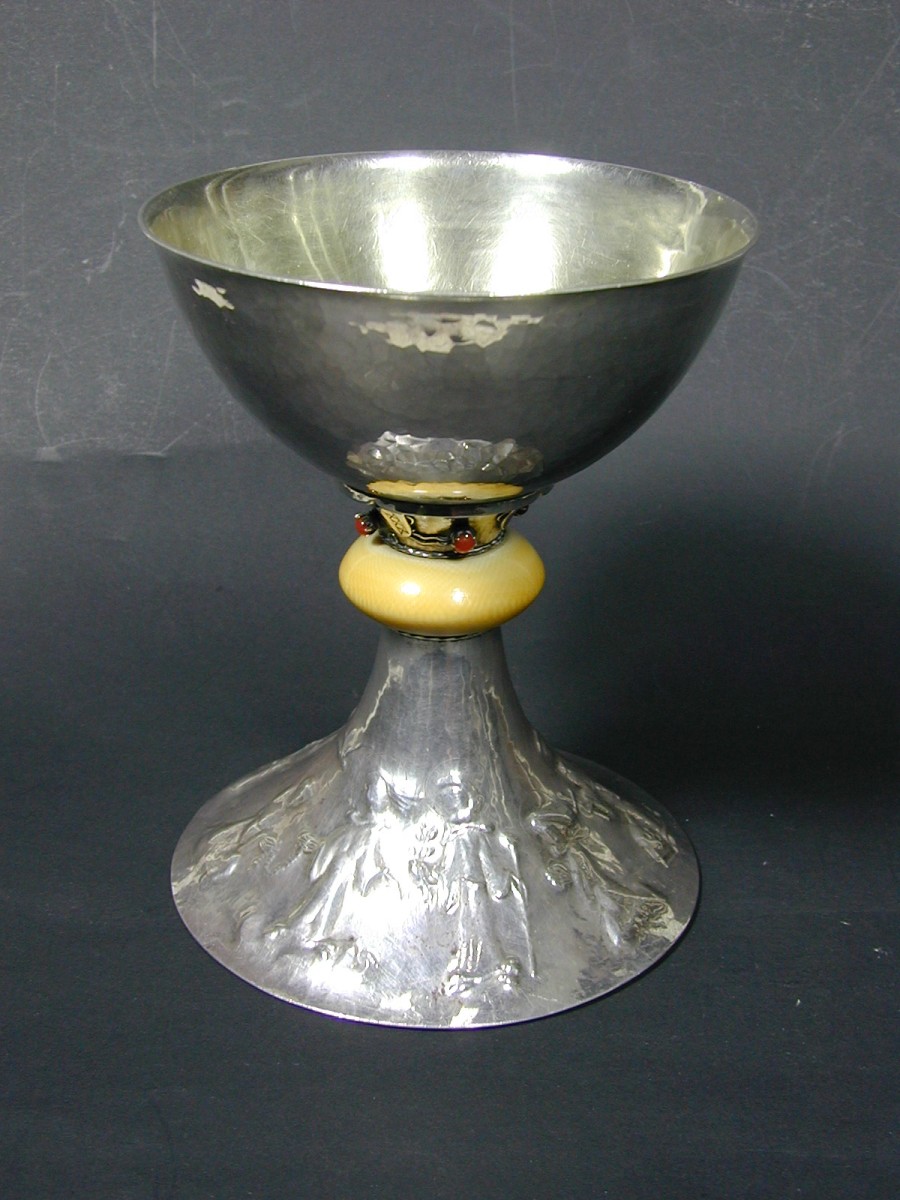 Kelk op ronde voet waarop o.a. Maria afgebeeld als Bruid van God de H. Geest, links H. Jozef, rechts knielt H. Dominicus de rozenkrans ontvangend, met ivoren nodus
