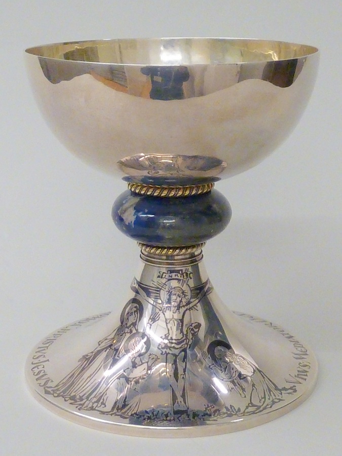 Kelk op ronde voet waarop gekruisigde Christus en "Unus Mediator Dei ..." in niëllo en nodus van lapis lazuli