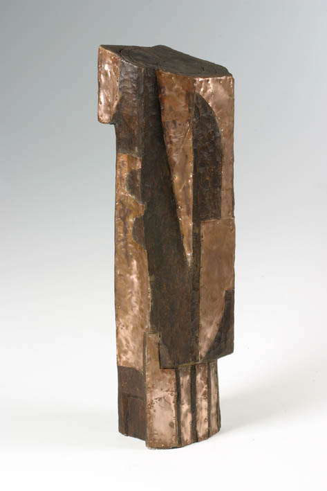 Abstracte engelfiguur in hout en koper.