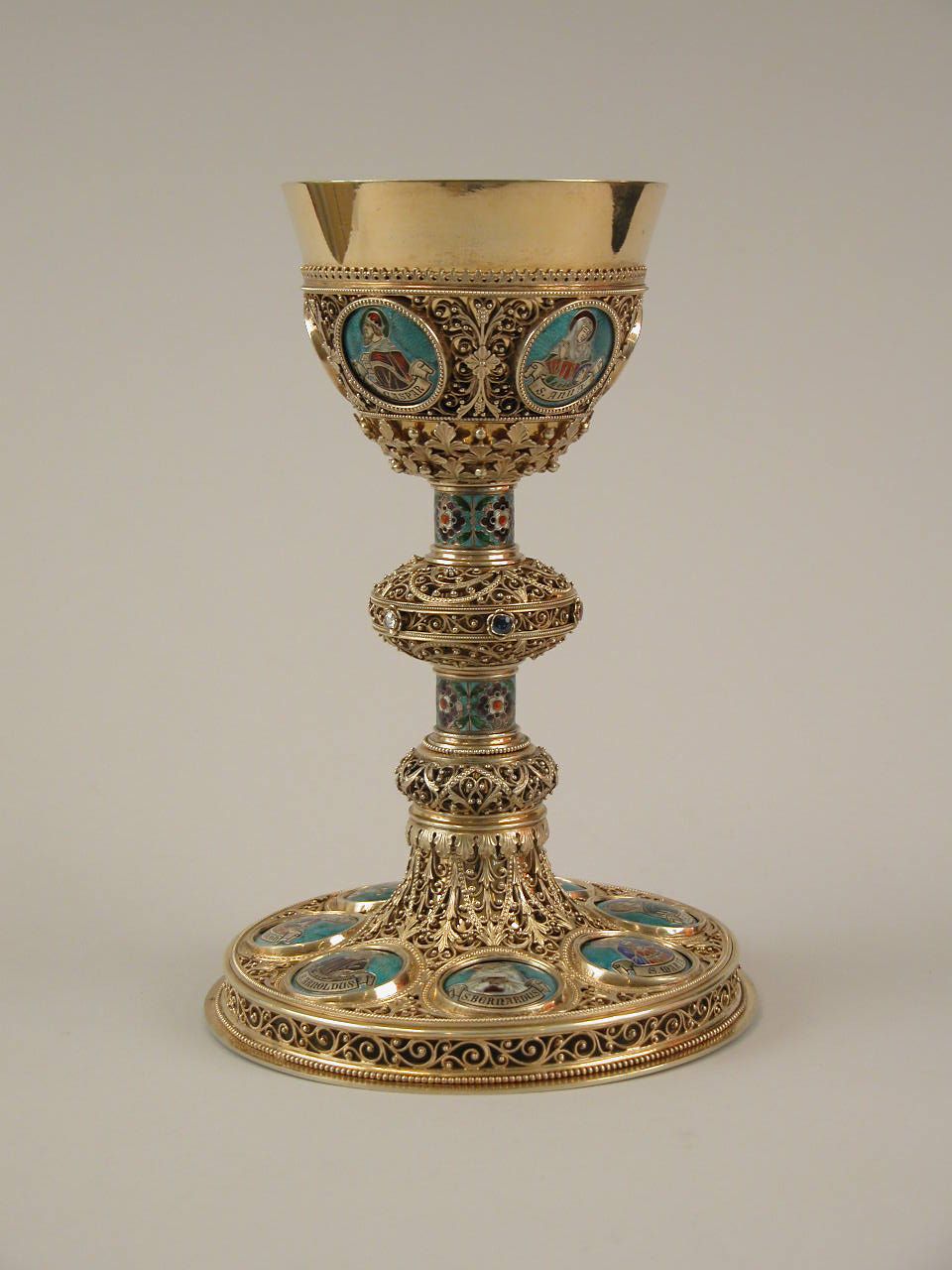 Verguld zilveren kelk op ronde voet, met filigraanwerk en twaalf emailmedaillons met o.a. H. Bernardus en zes (edel)stenen op nodus