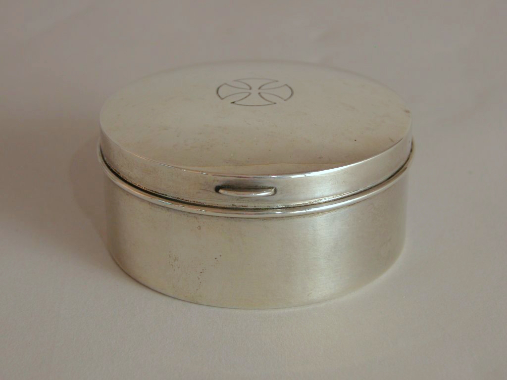 Zilveren(?) lunuladoos met gegraveerd gelijkarmig kruis op deksel, aan binnenzijde verguld