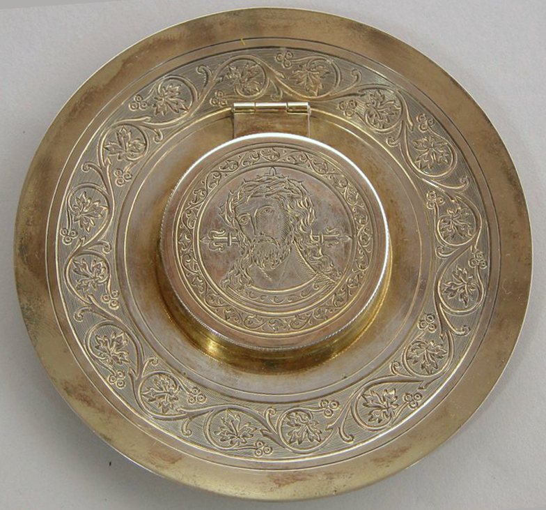Schotelvormige ziekenpyxis met op deksel een gegraveerd portret van Christus met doornenkroon