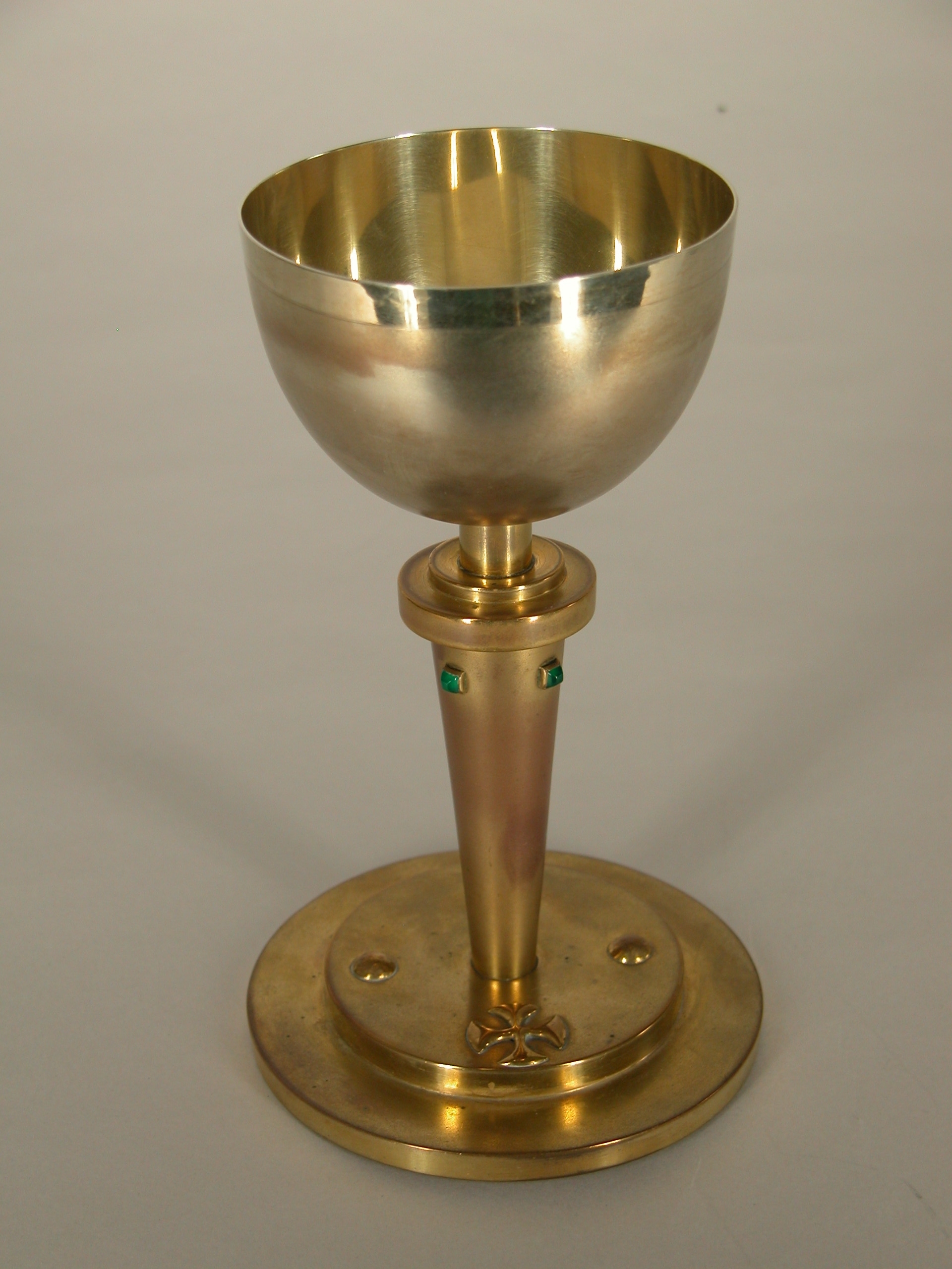 Kelk op ronde voet waarop gelijkarmig kruis, met vier groene steentjes op stam