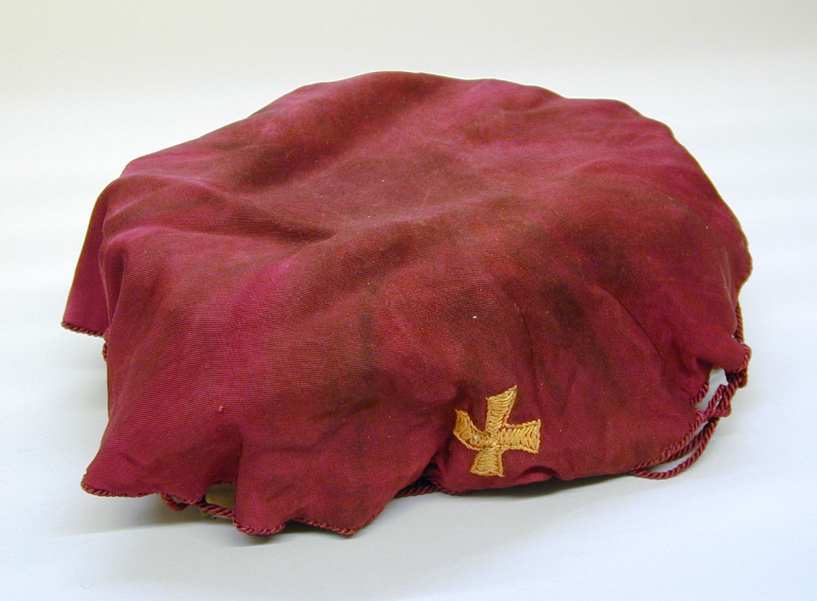 Paarse ziekenbeurs met geborduurd geel kruisje
