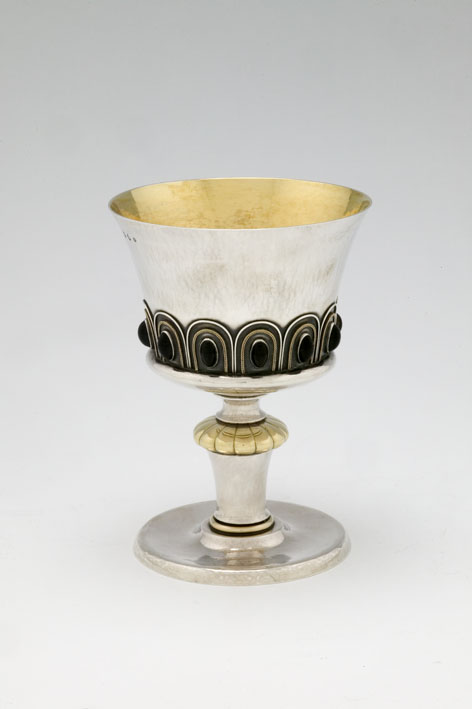 Kelk op ronde voet met gouden nodus en met twaalf zwarte stenen in aaneengesloten ronde bogen op cuppa