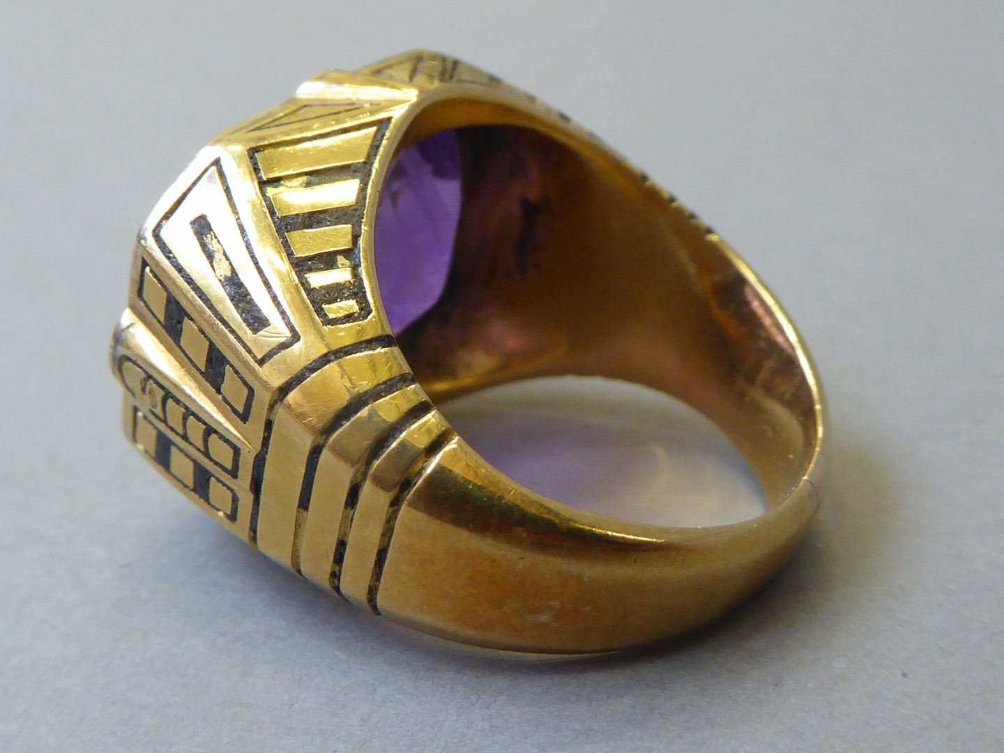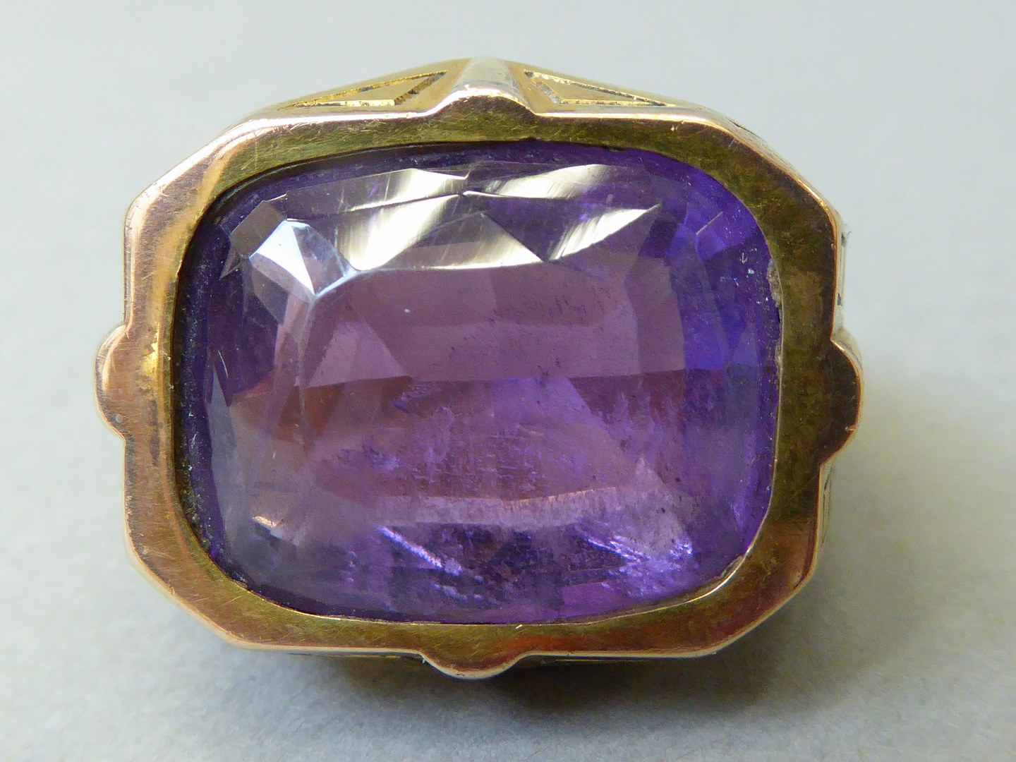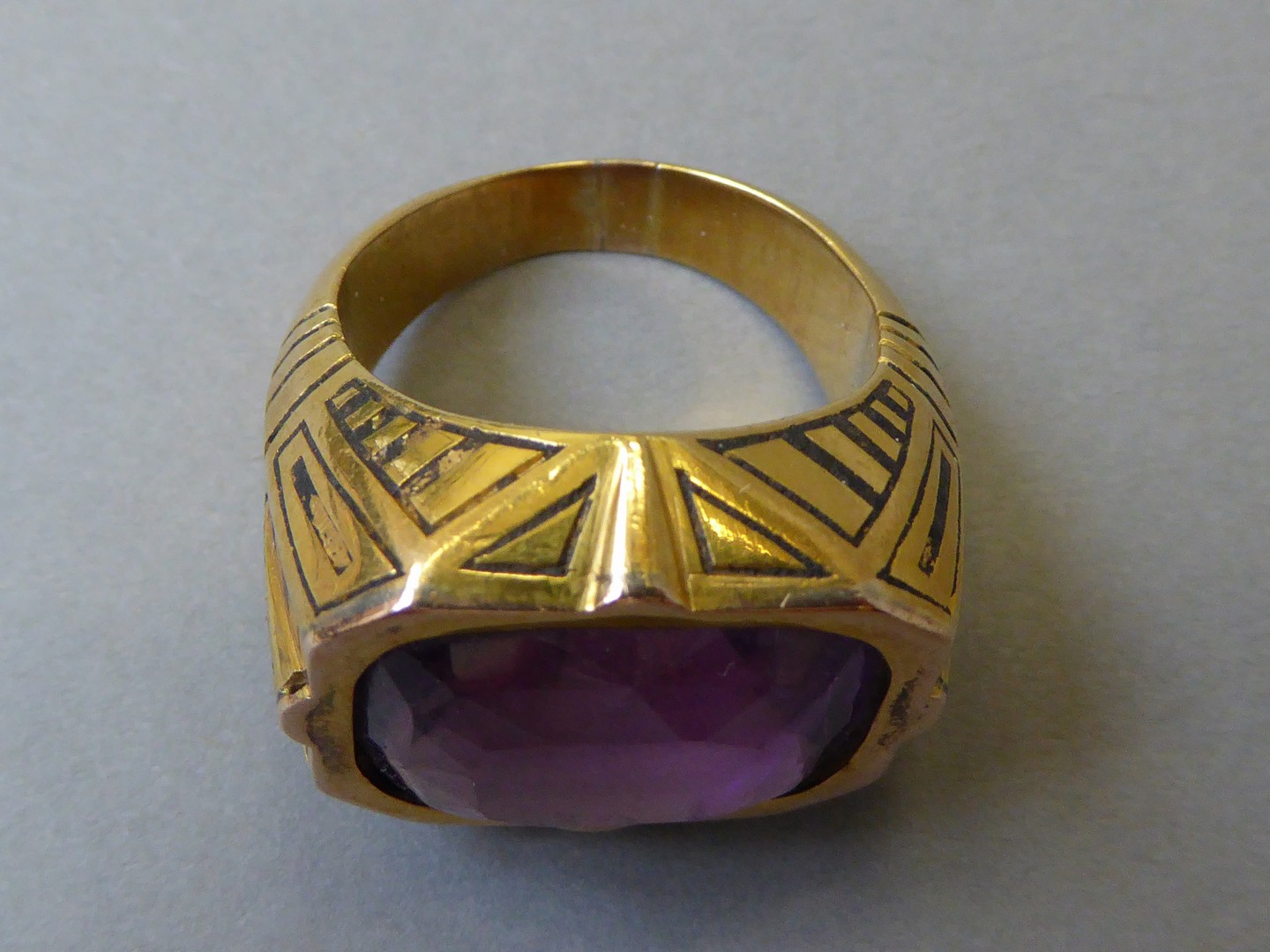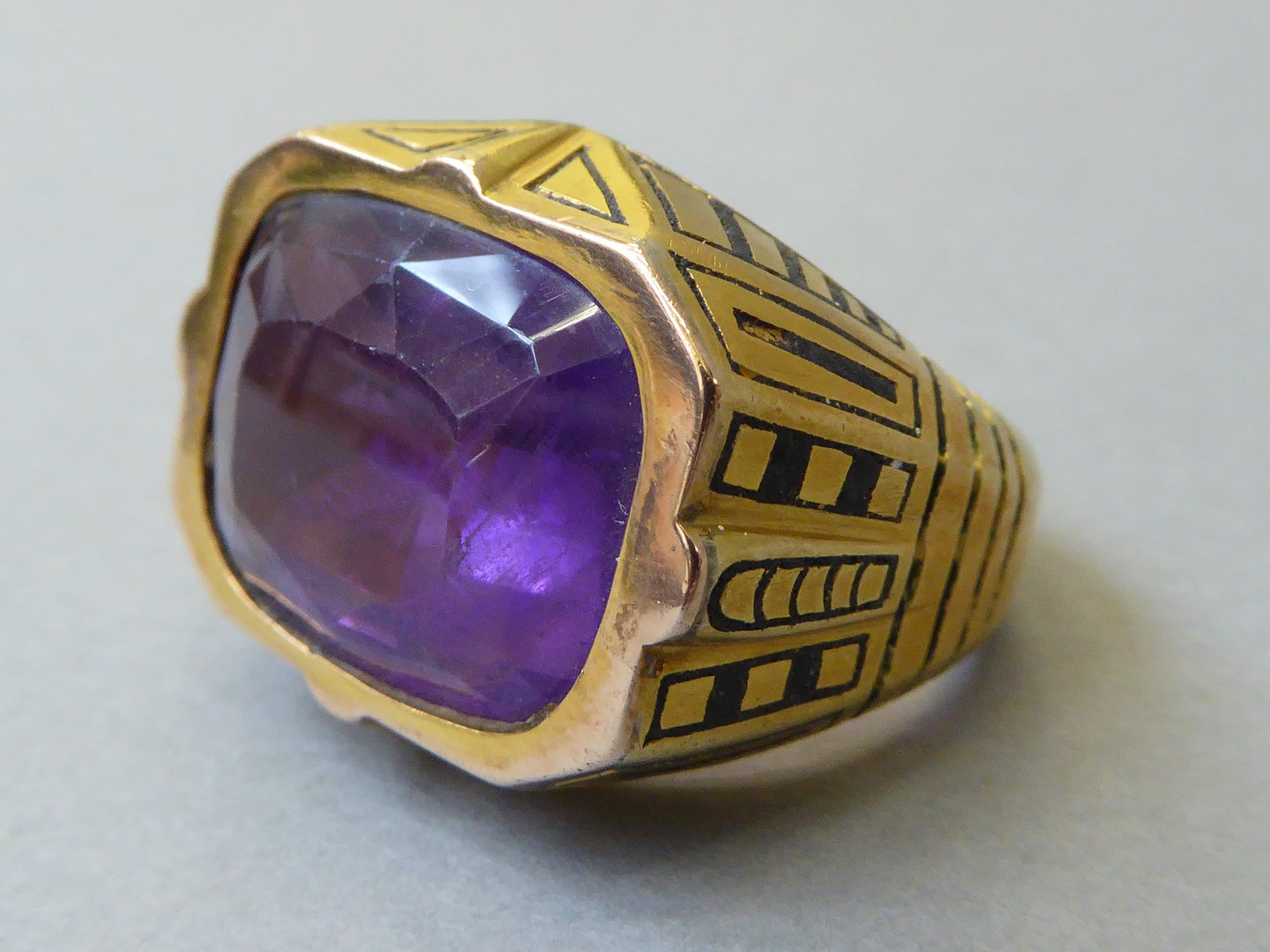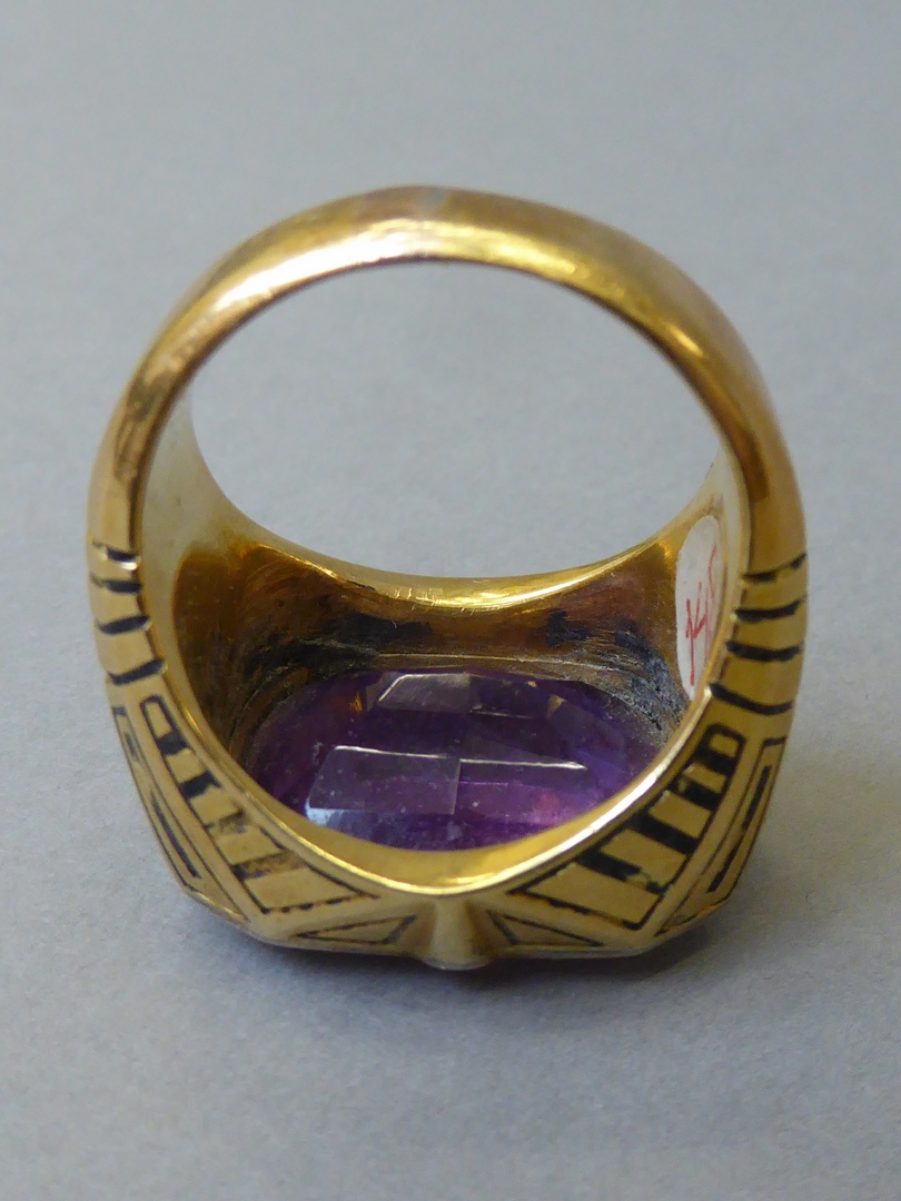 Gouden abtsring met geometrische motieven waarin roze hoekig geslepen amethist is gezet