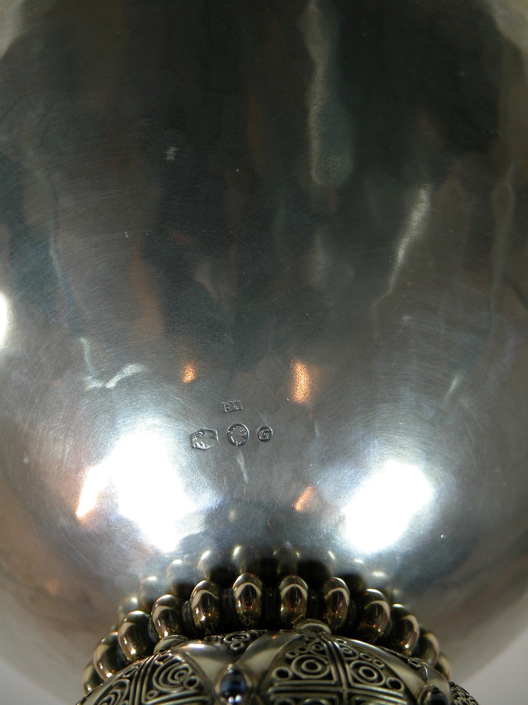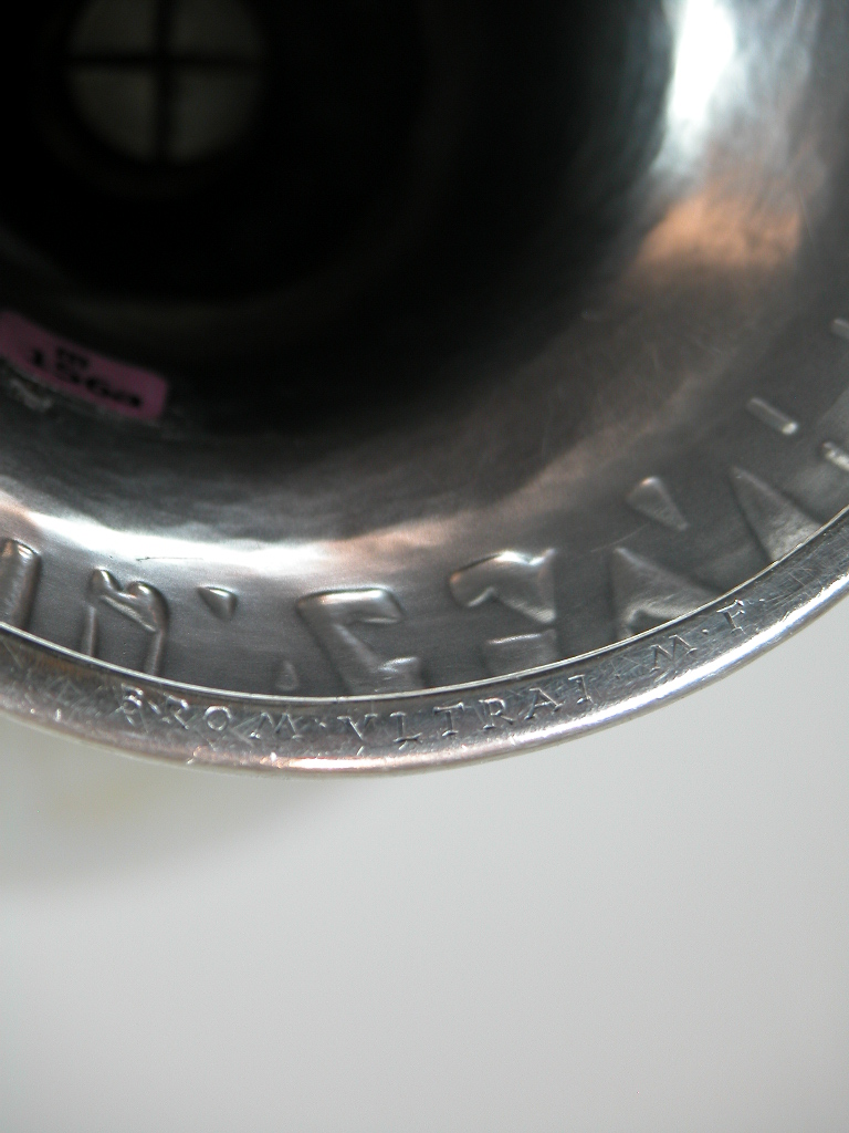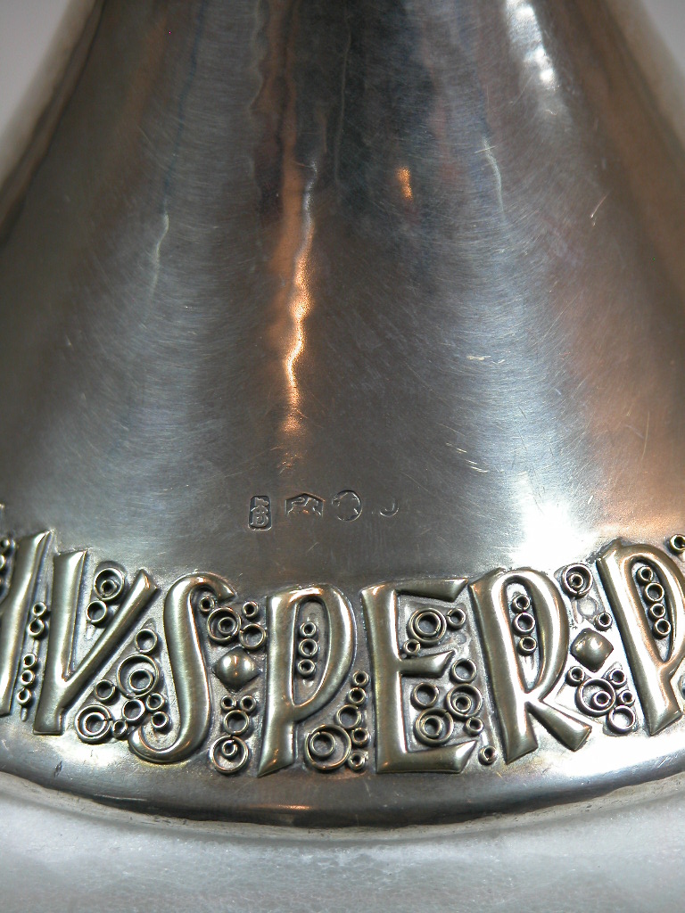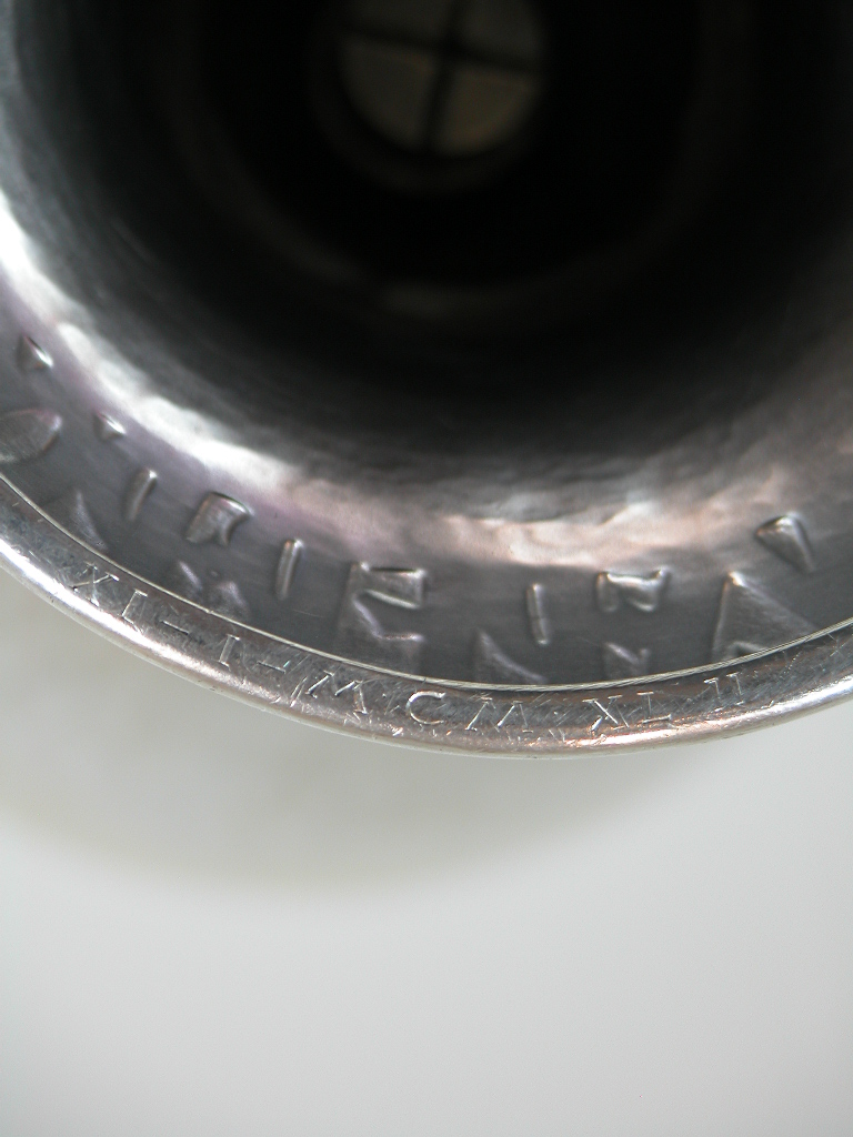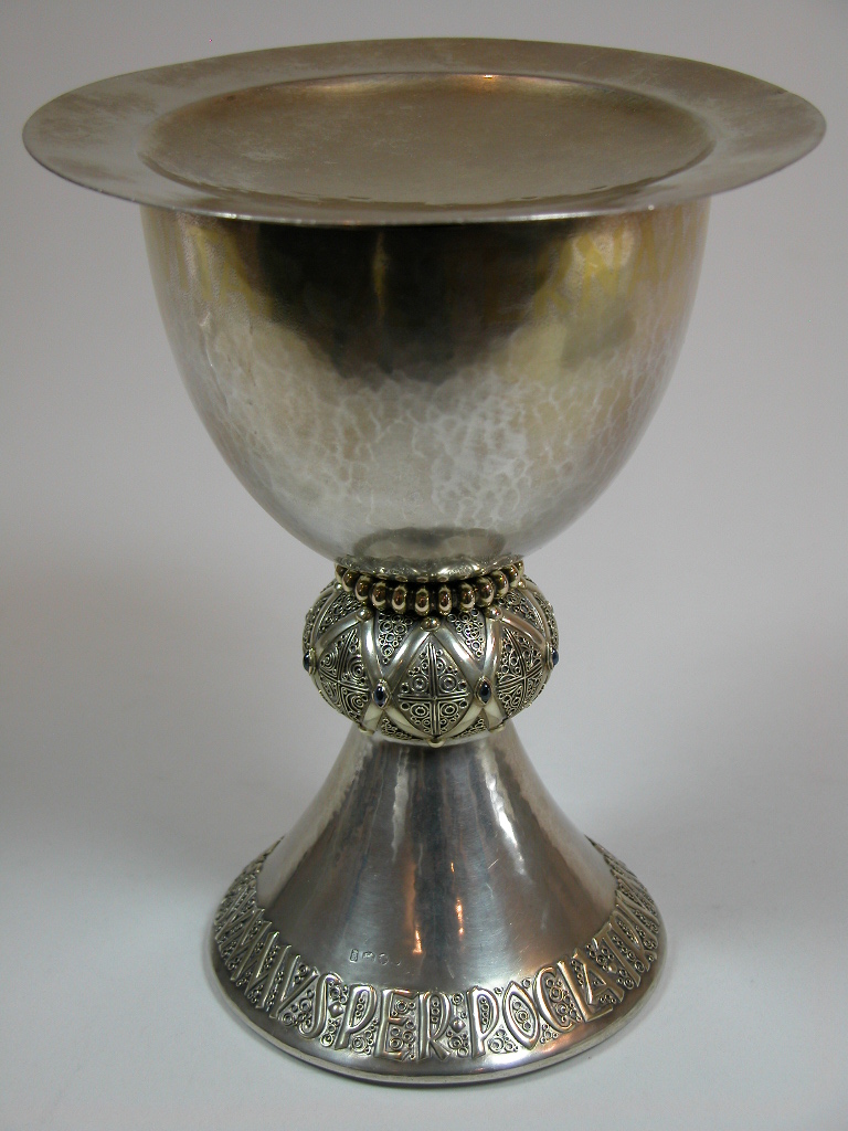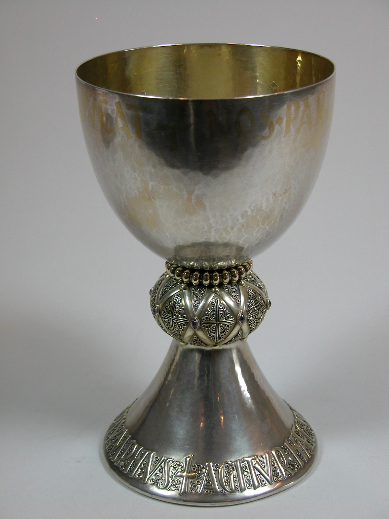 Kelk op ronde voet met "Agitur haec summus per pocla triumphus", met op cuppa "Nos pariter ad vitam aeternam perducat"