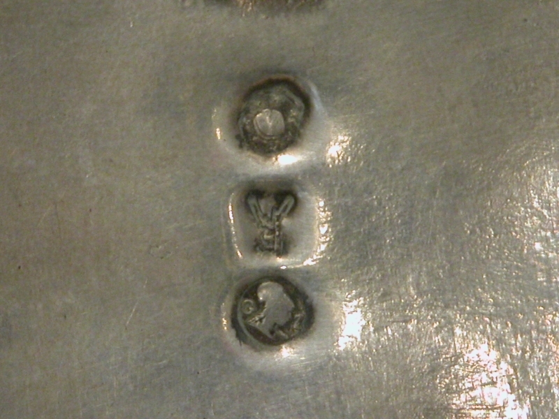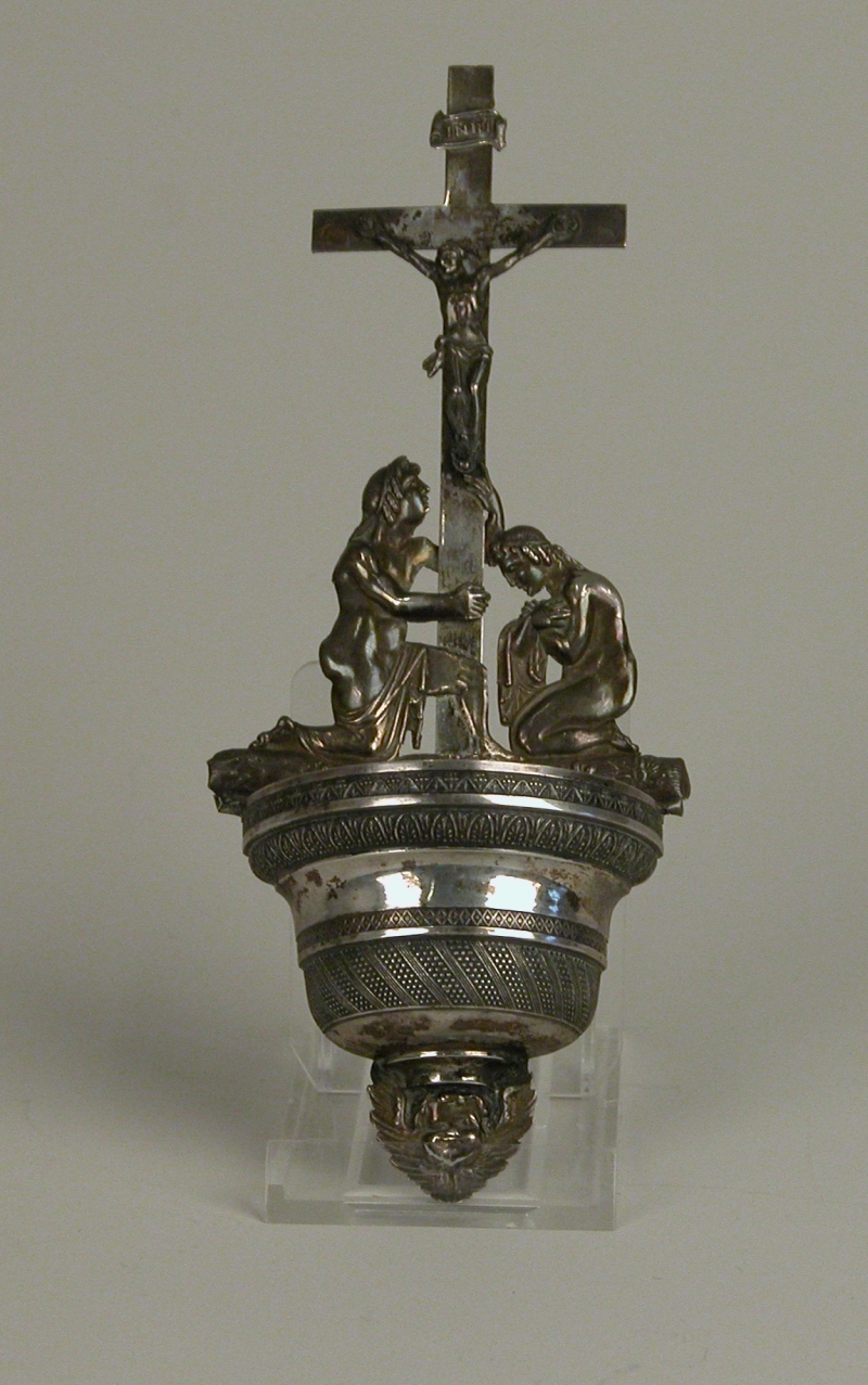 Wijwaterbak met crucifix met INRI en twee geknielde figuren, onderaan een cherub