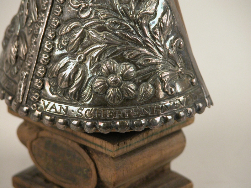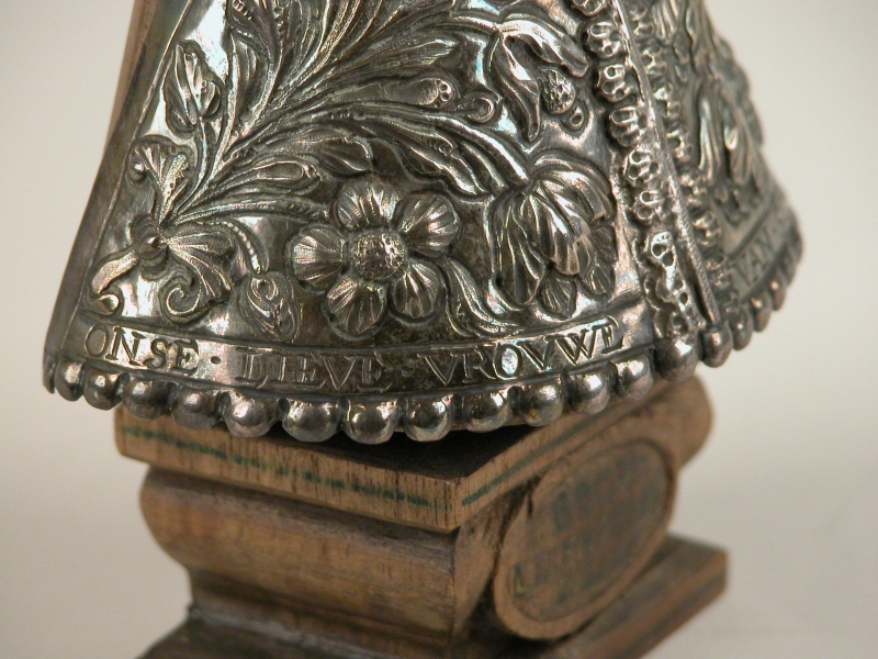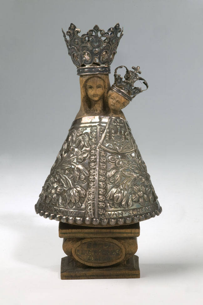 Houten beeldje van O.L.V. Scherpenheuvel met zilveren bekleding met bloemen en zilveren kroontjes
