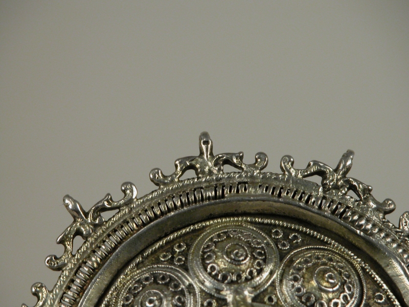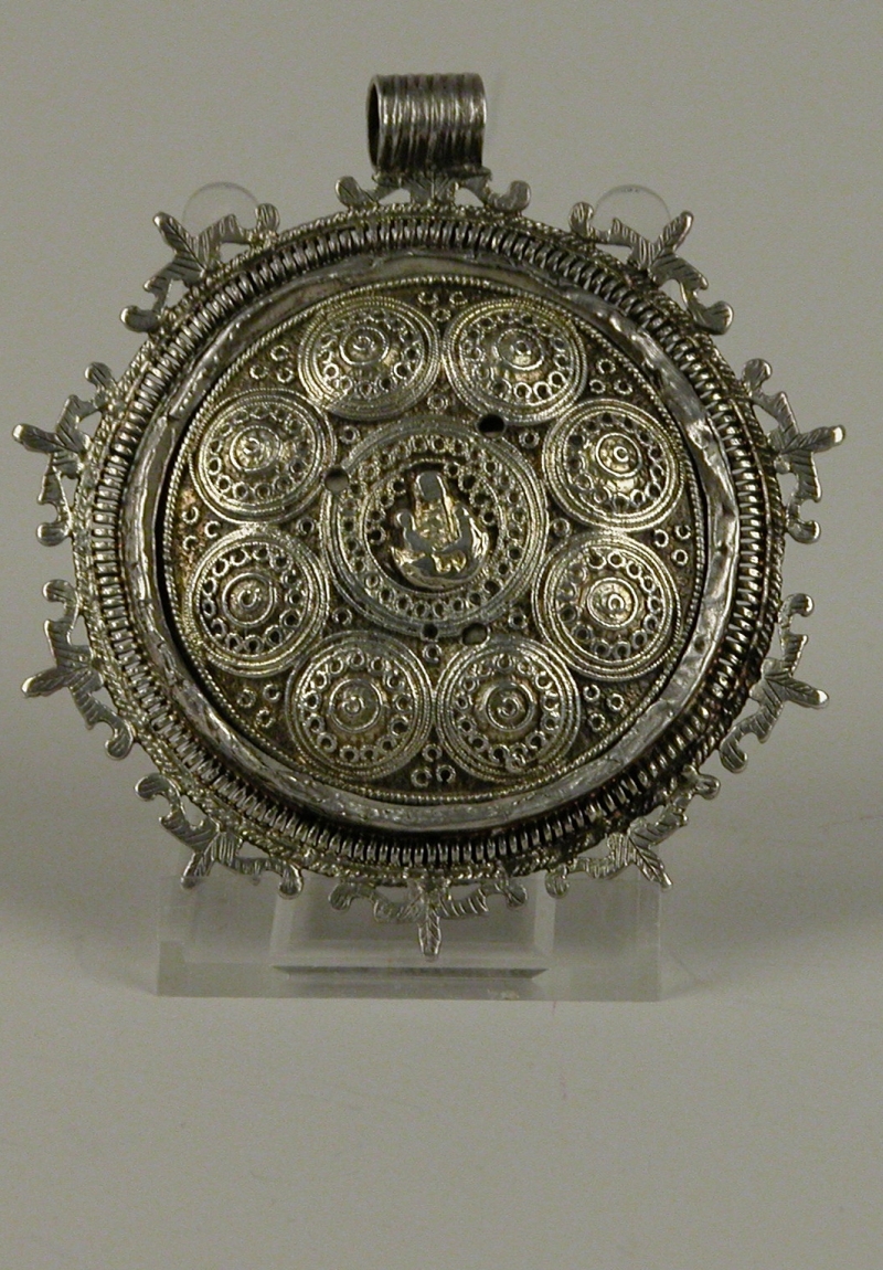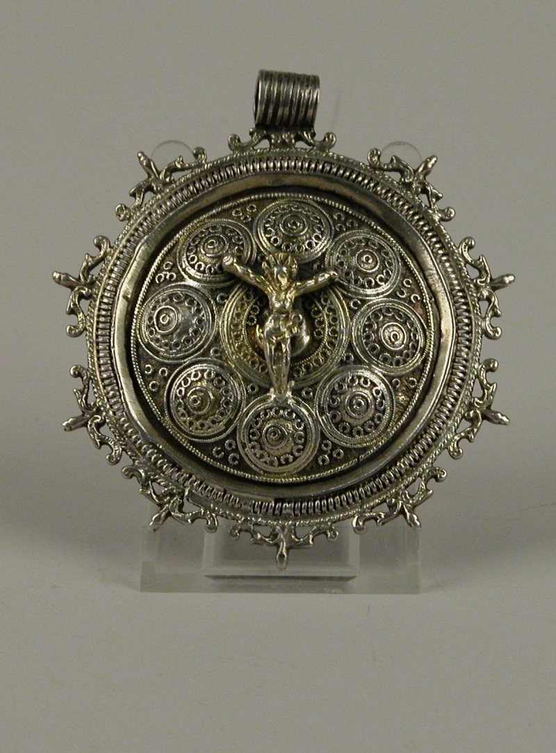 Reliekmedaillon met Christuscorpus waaromheen acht filigraancirkels, aan achterzijde Maria met kind waaromheen acht filigraancirkels, aan bovenzijde brede ring