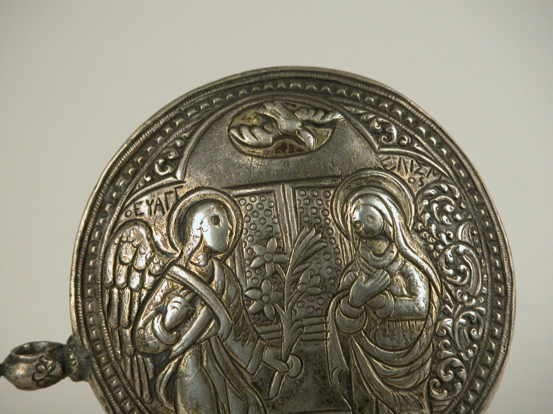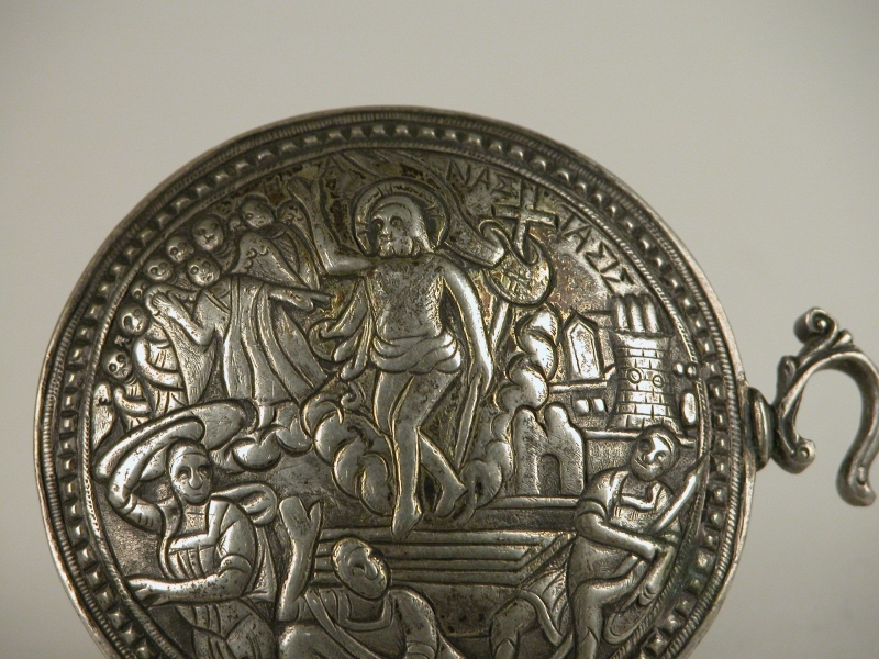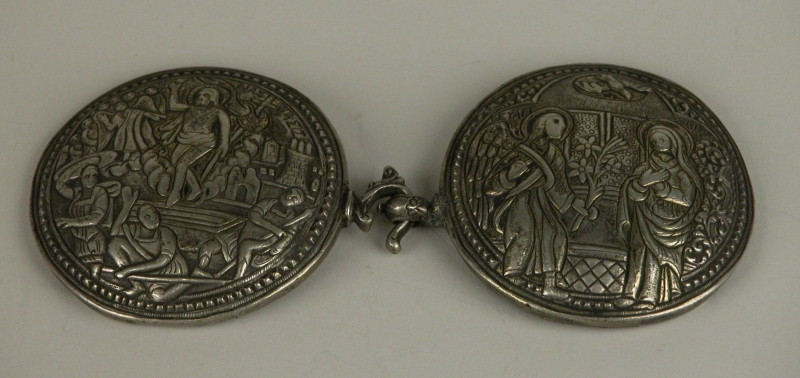 Dubbele gesp in Griekse stijl, linker gesp toont Verrijzenis van Christus, rechtergesp toont de Annunciatie, verbonden met haak- en oogsluiting