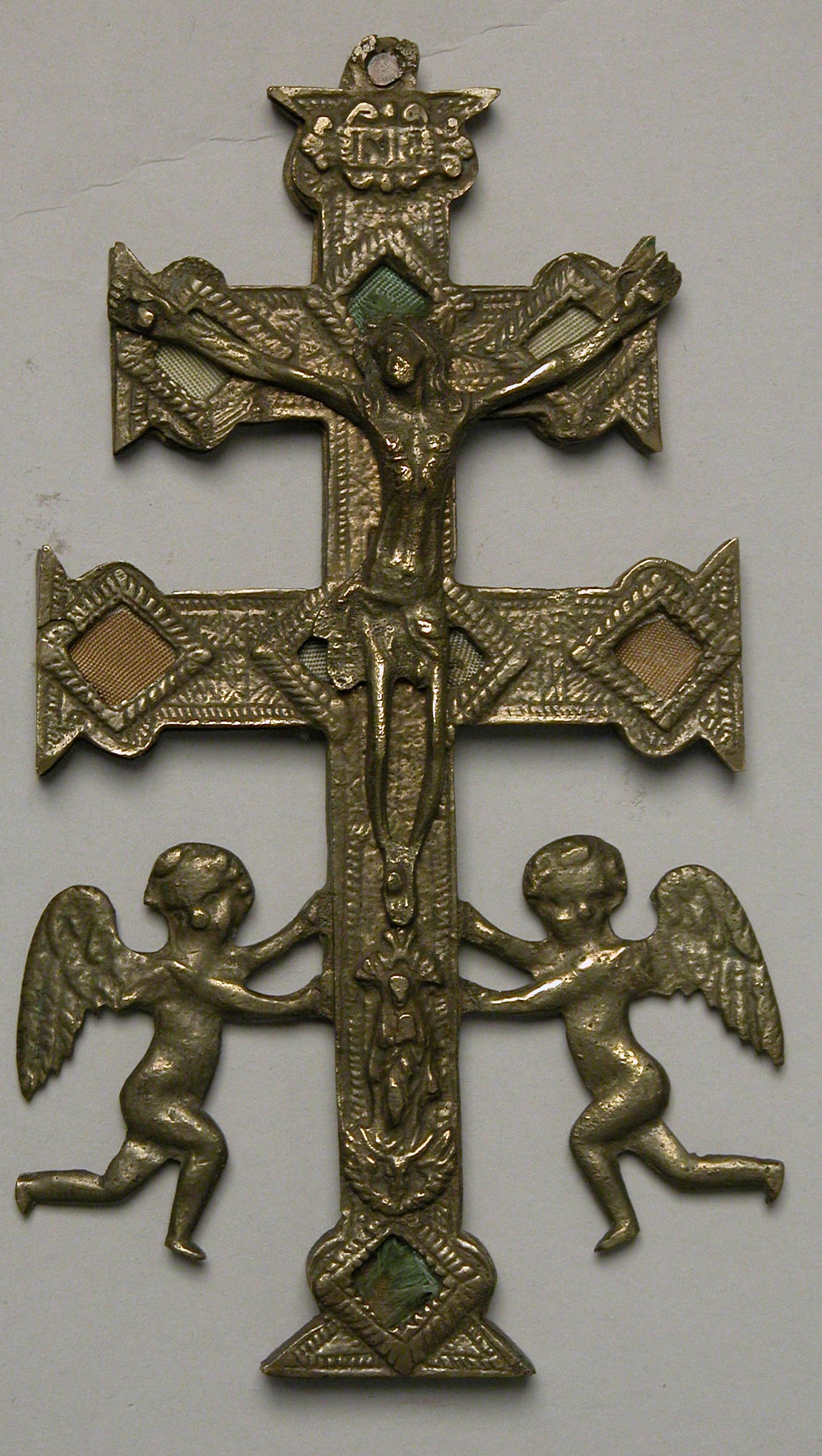 Caravacakruis met gekruisigde Christus en Maria en twee engeltjes aan de zijkant