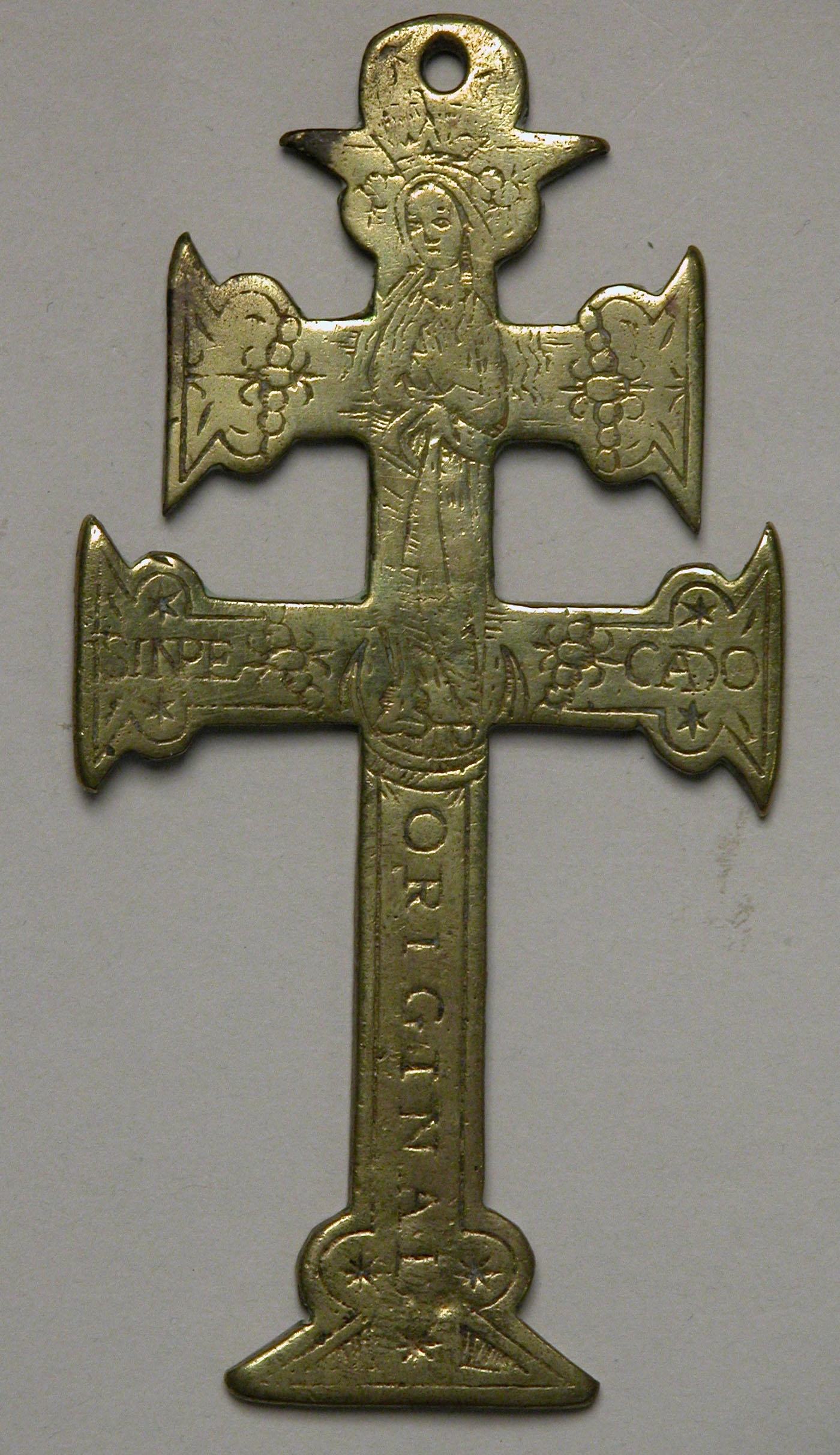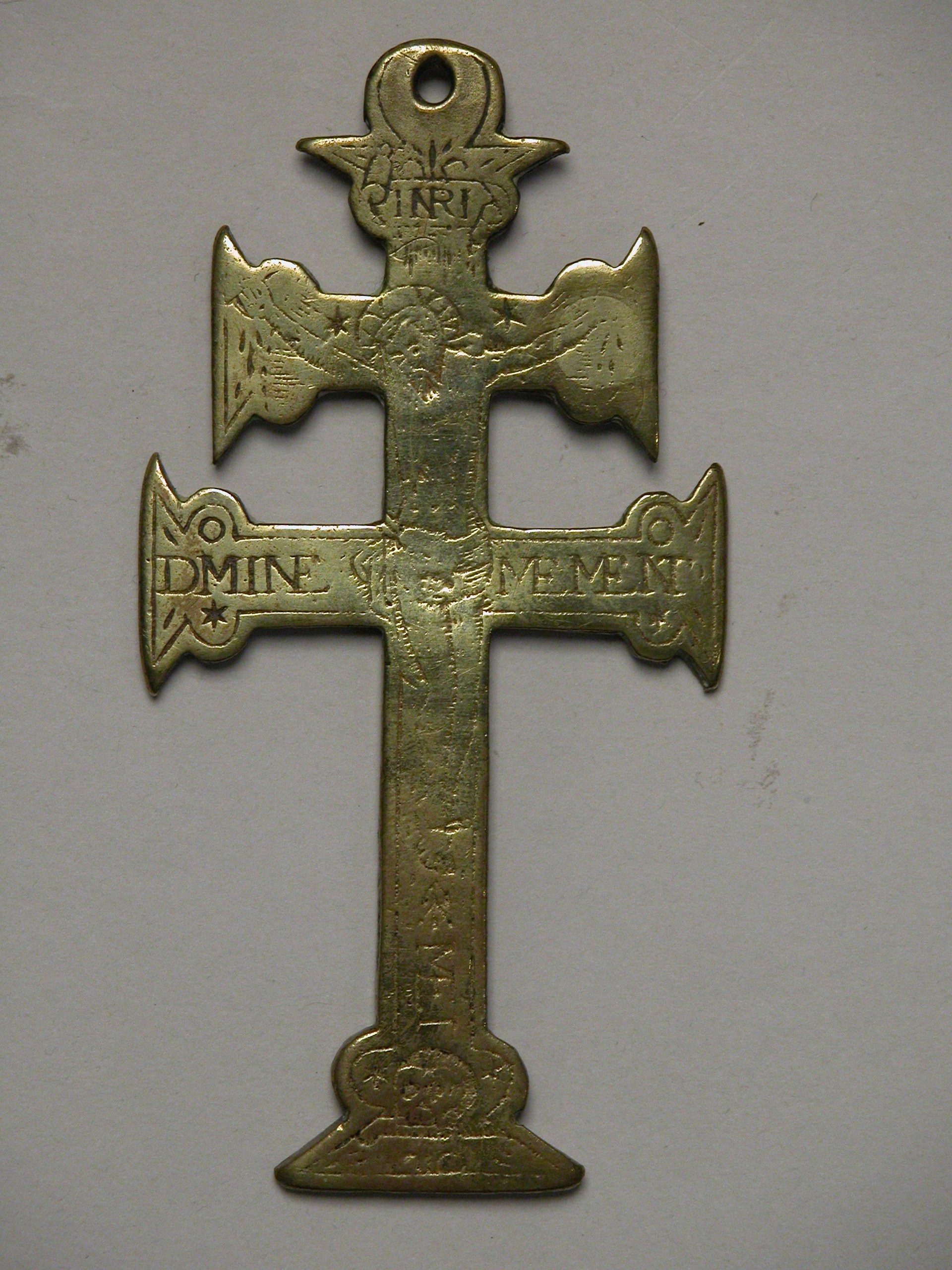 Caravacakruis met afbeelding van Christus met "Domine memento mei", kz. Maria met "Sine peccado original"
