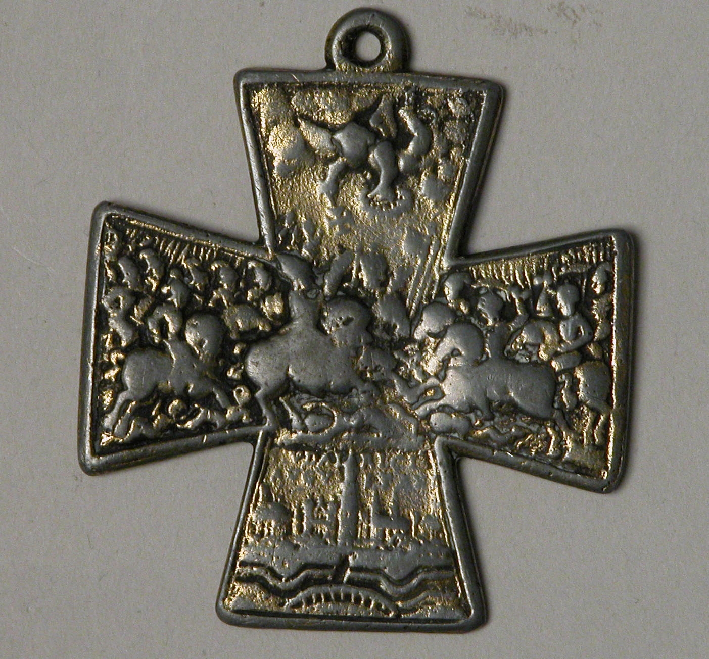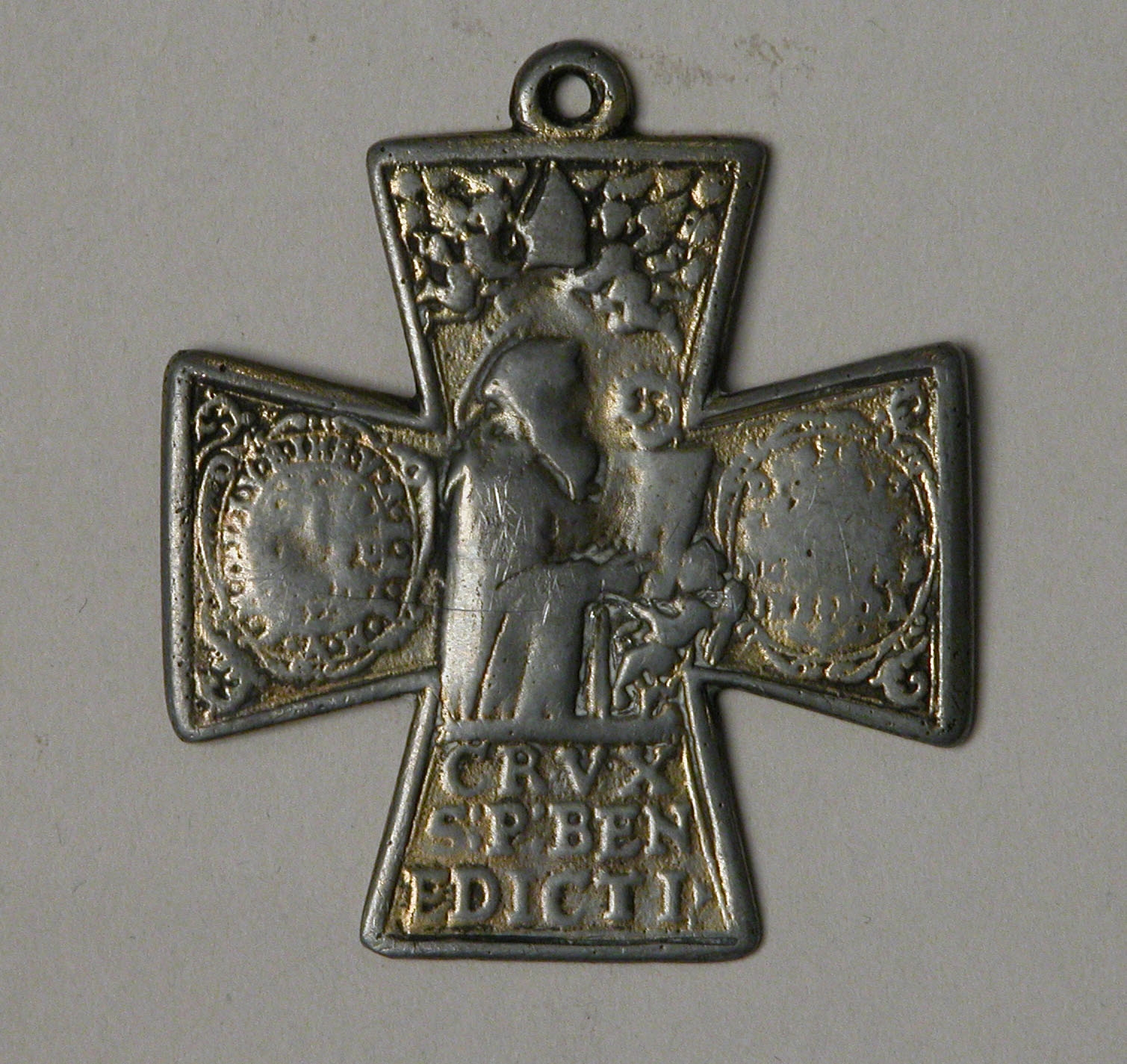 St. Ulrichskruis met aan voorzijde Ulirich te paard, kz. H. Benedictus van Nursia met tekst "Crux S.P. Benedicti"