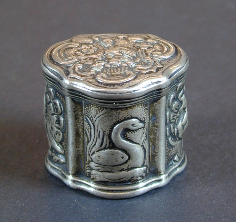 Loddereindoosje met vrouwenfiguur met bloemen, de Reuk(?), op zijkanten zwaan en pauw