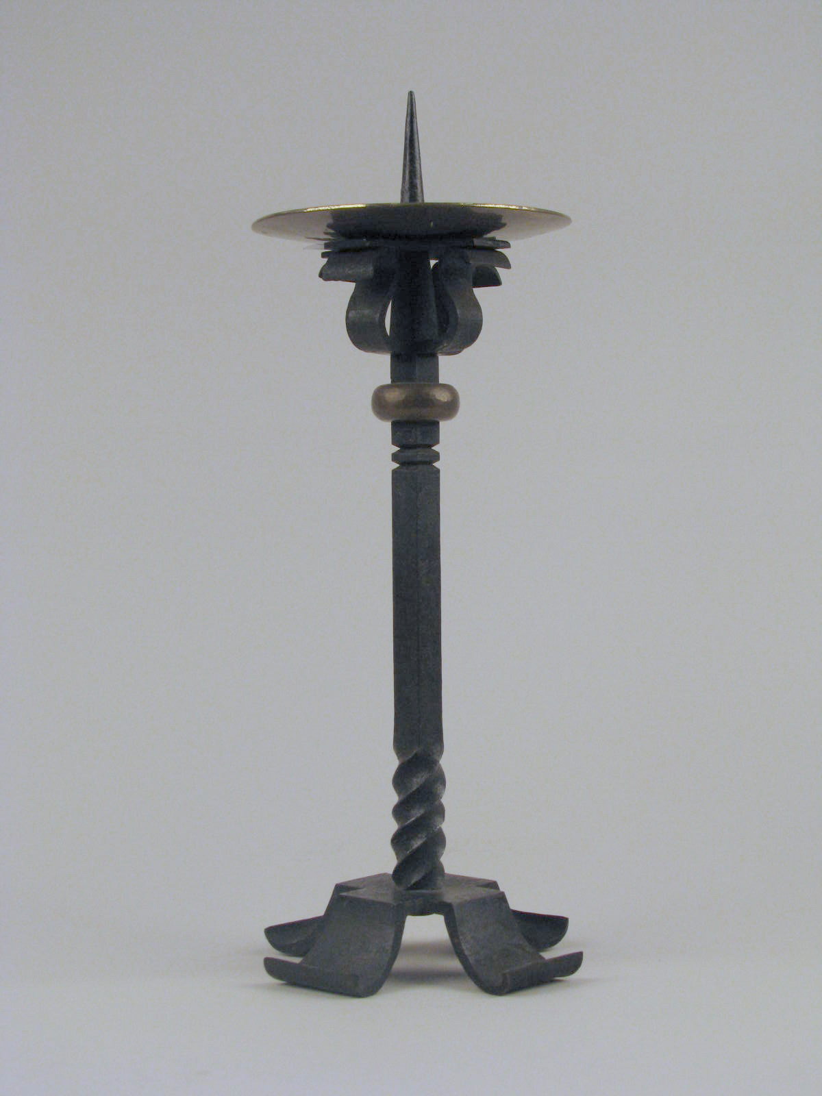 Smeedijzeren kandelaar op vierpoot, deels gedraaide stam met bovenin messing nodus, met messing vetvanger