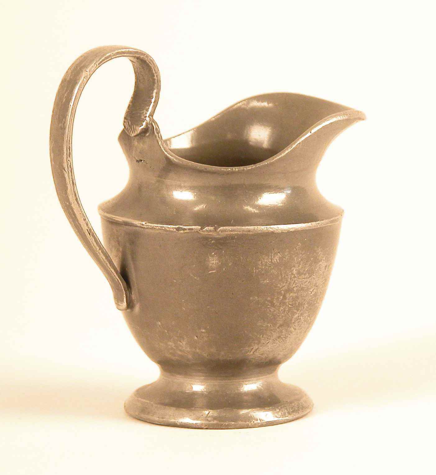 Ampul, in empirestijl, op ronde voet, half-eivormige buik met gekruld oor, naar boven toe versmallend en eindigend in brede schenktuit