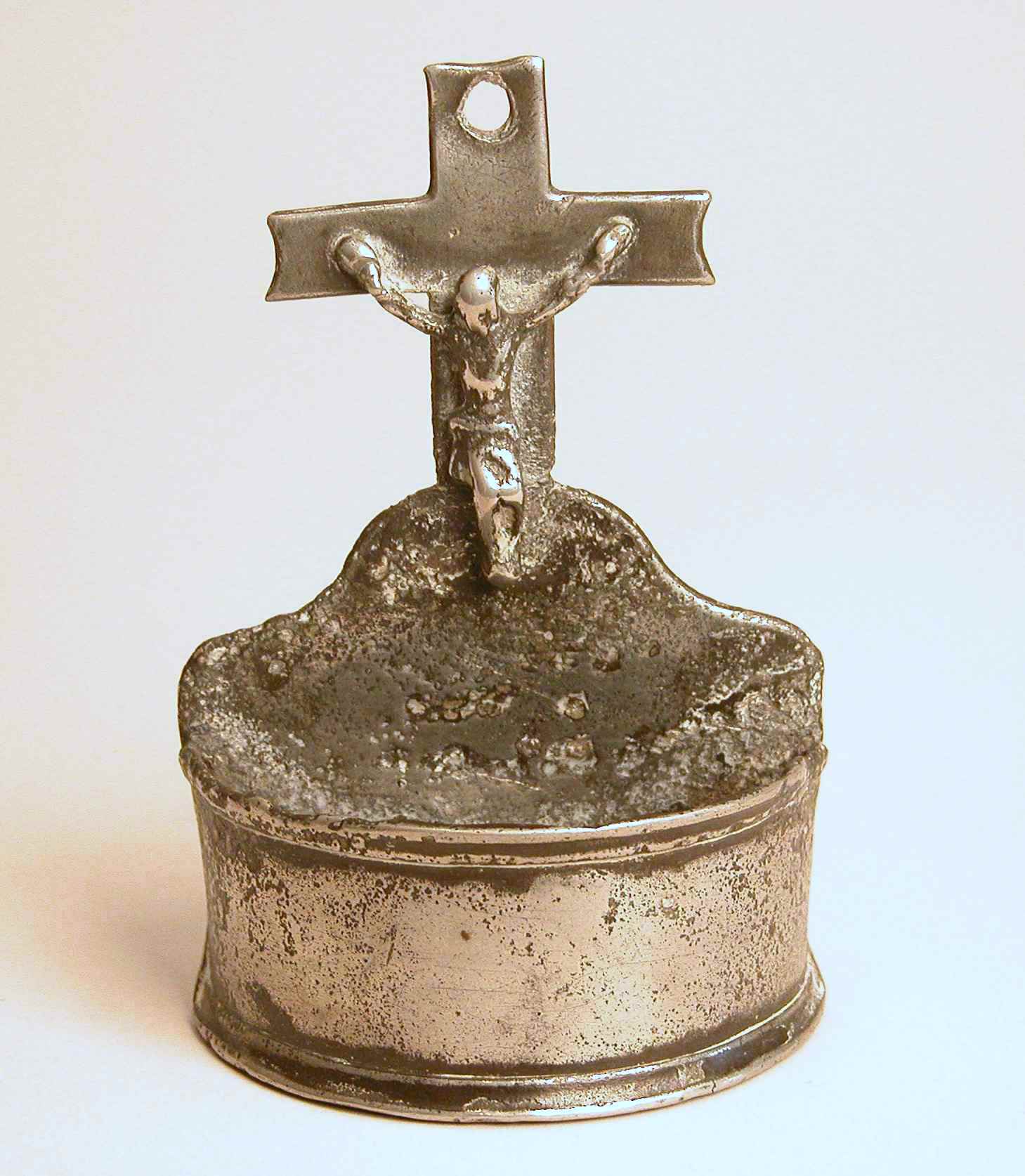 Halfrond wijwaterbakje met sierlijk gebogen achterwand waarop kruisje met in reliëf een Christusfiguur