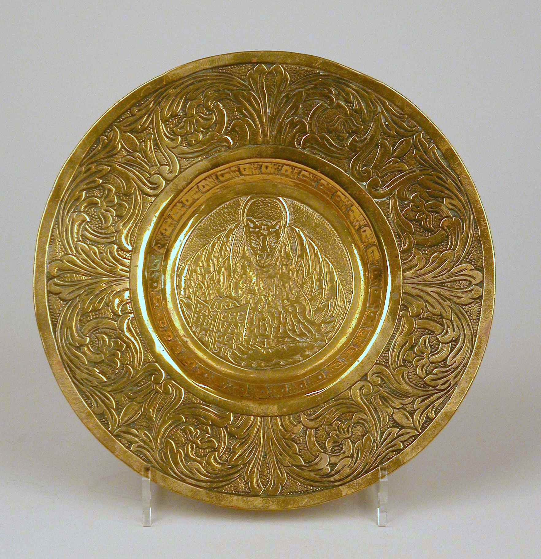 Messing pateen in barokstijl met handgedreven randversiering met arabesken en acanthusbladen en in het midden H. Marcus in leeuwgedaante