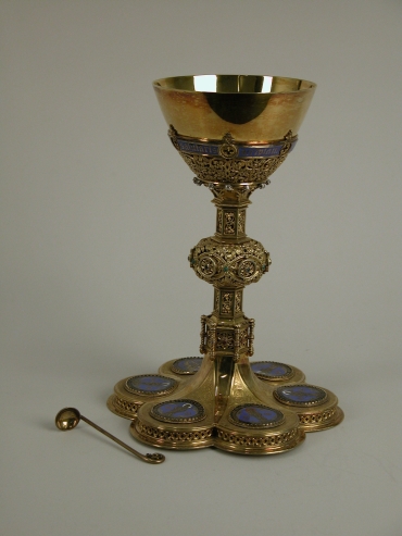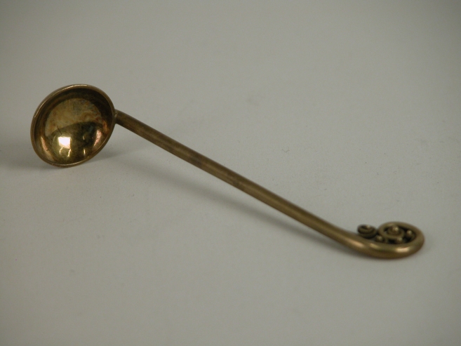 Vergulde kelklepel met gekruld uiteinde versierd met ajourwerk