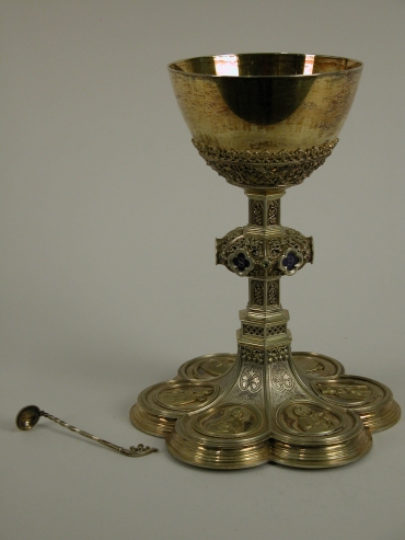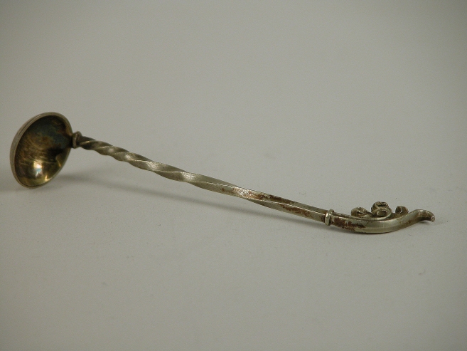 Vergulde kelklepel met gedraaide steel en uiteinde versierd met bladmotief