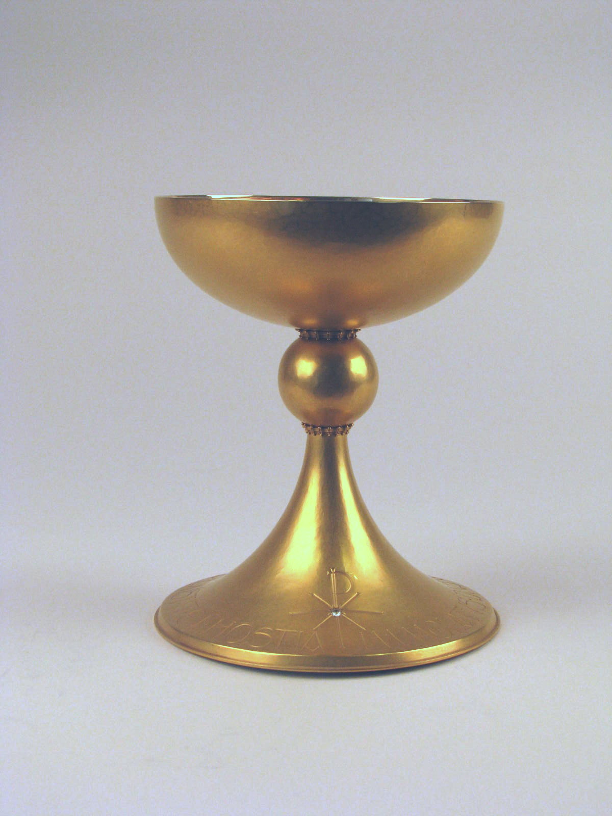 Verguld zilveren kelk op ronde voet waarop "Immolatus dns ipse sacerdos existit et hostia" en Christusmonogram met briljant