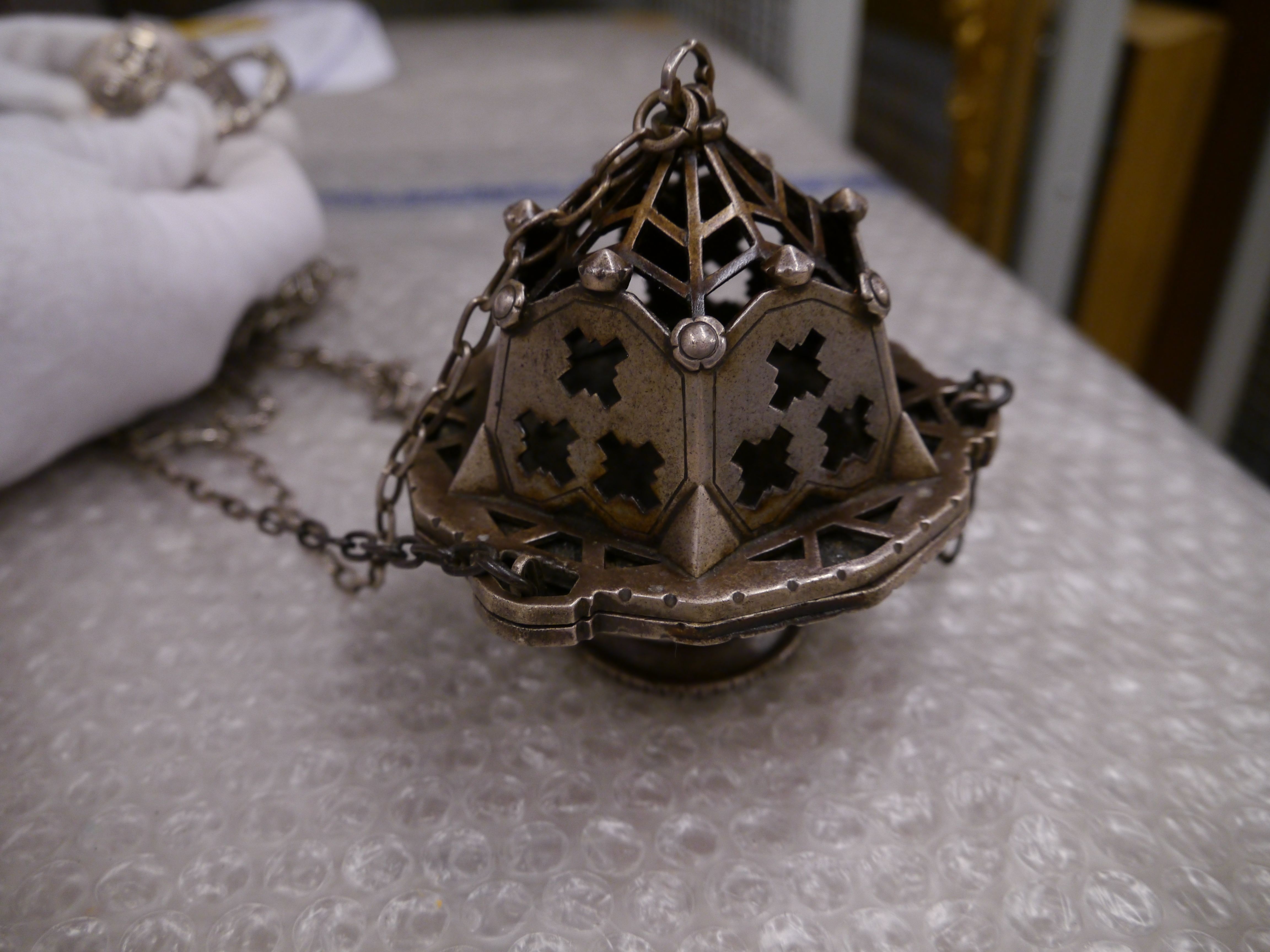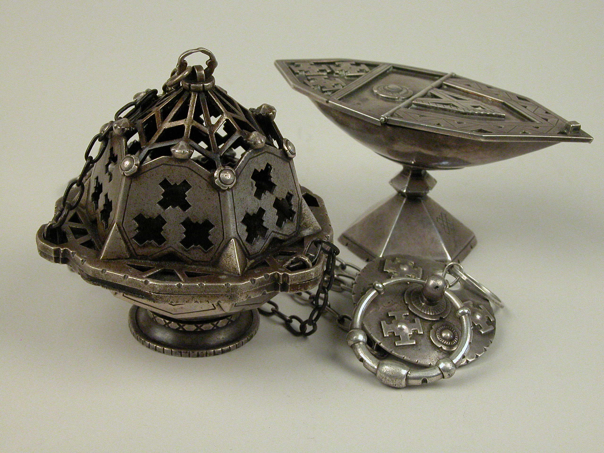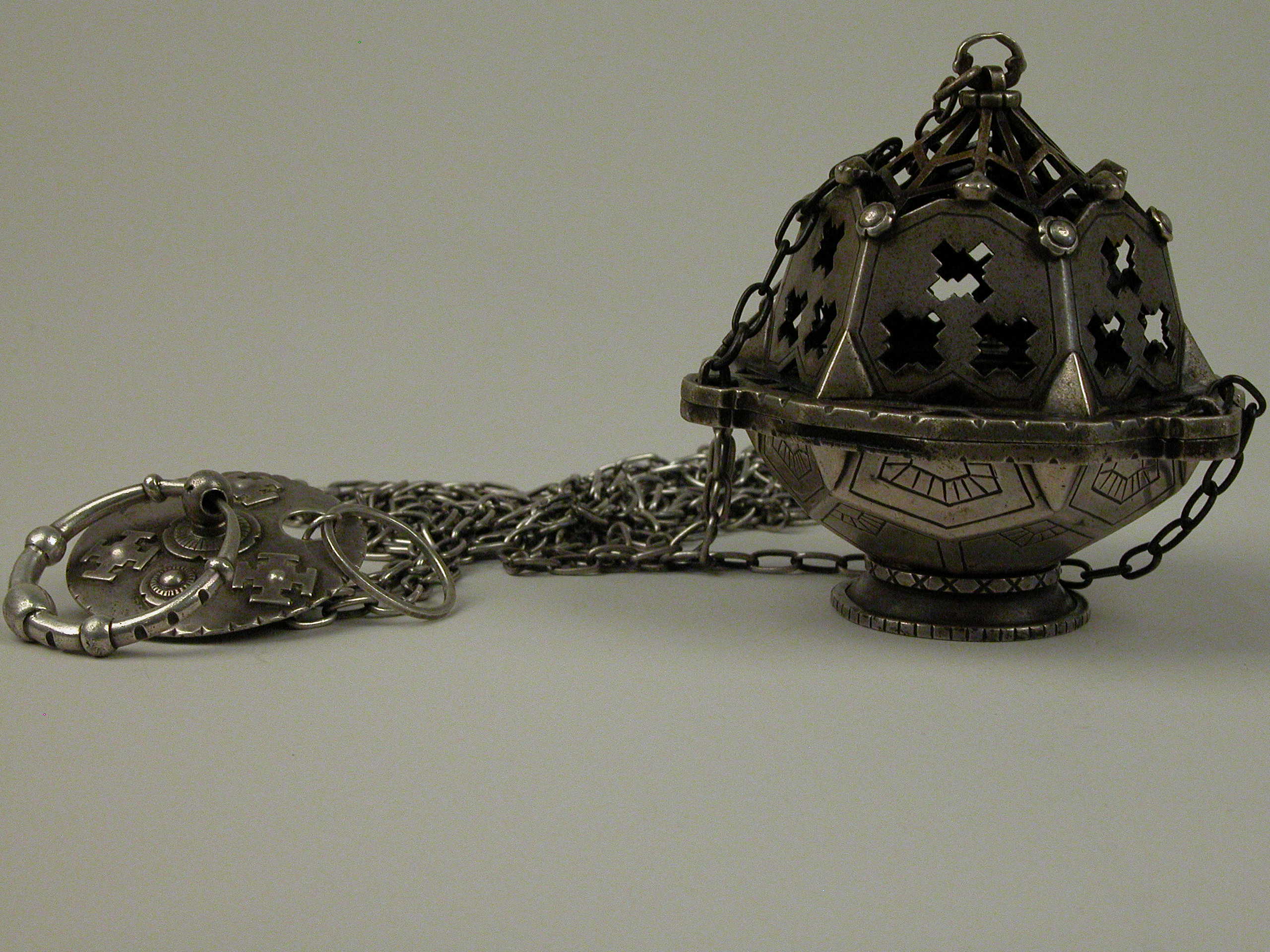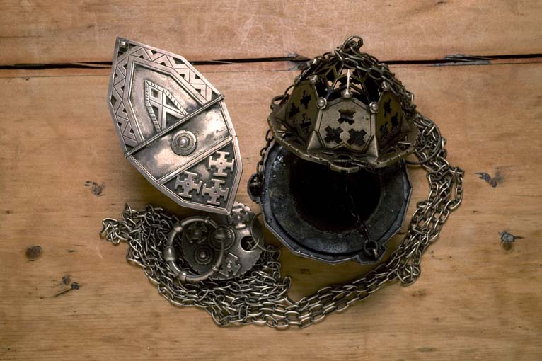 Wierookvat met het wapen van de Sint Paulusabdij Oosterhout op kettingplaatje en met variaties daarop van uitgespaarde kruisjes en roosjes op deksel