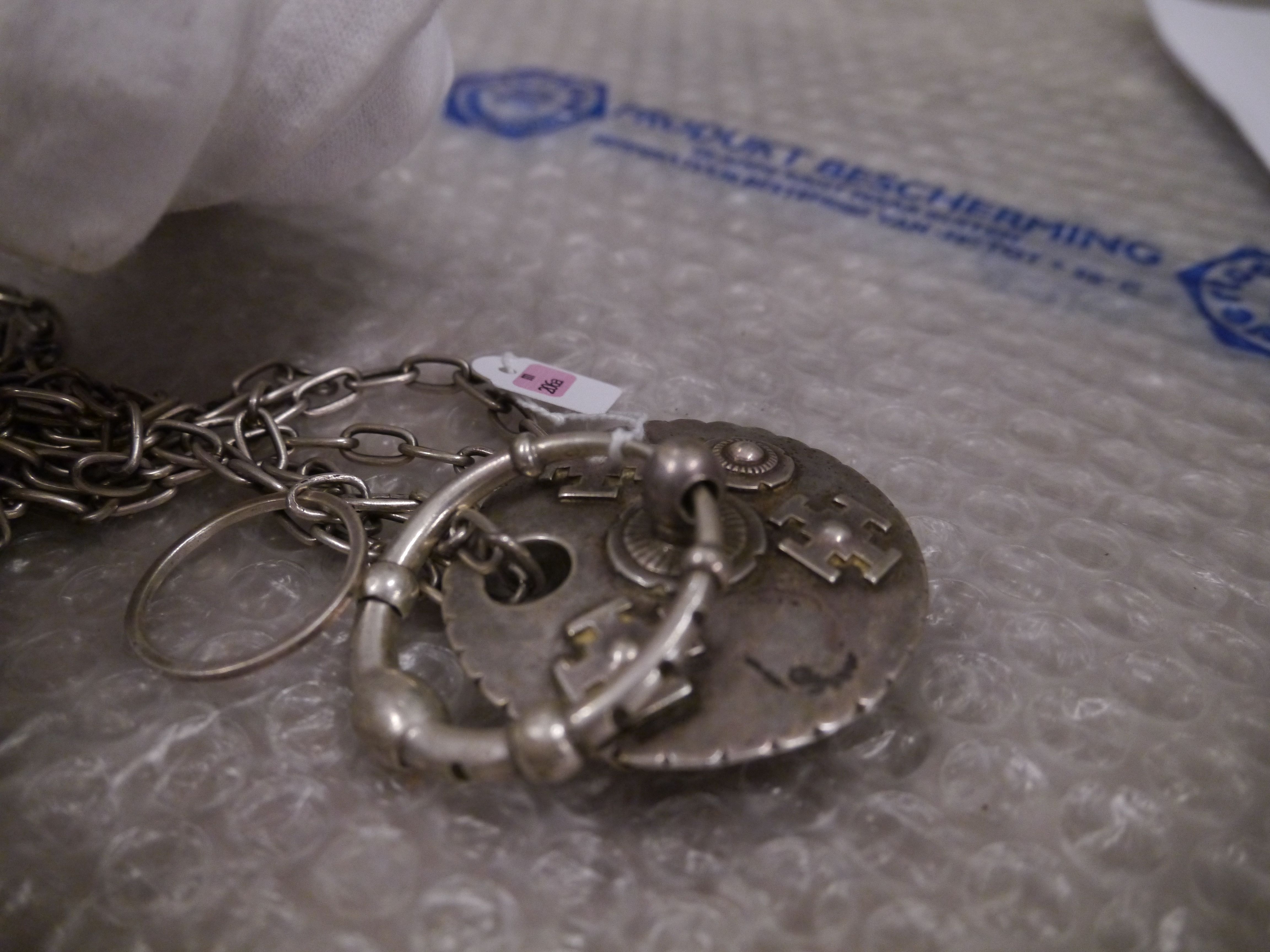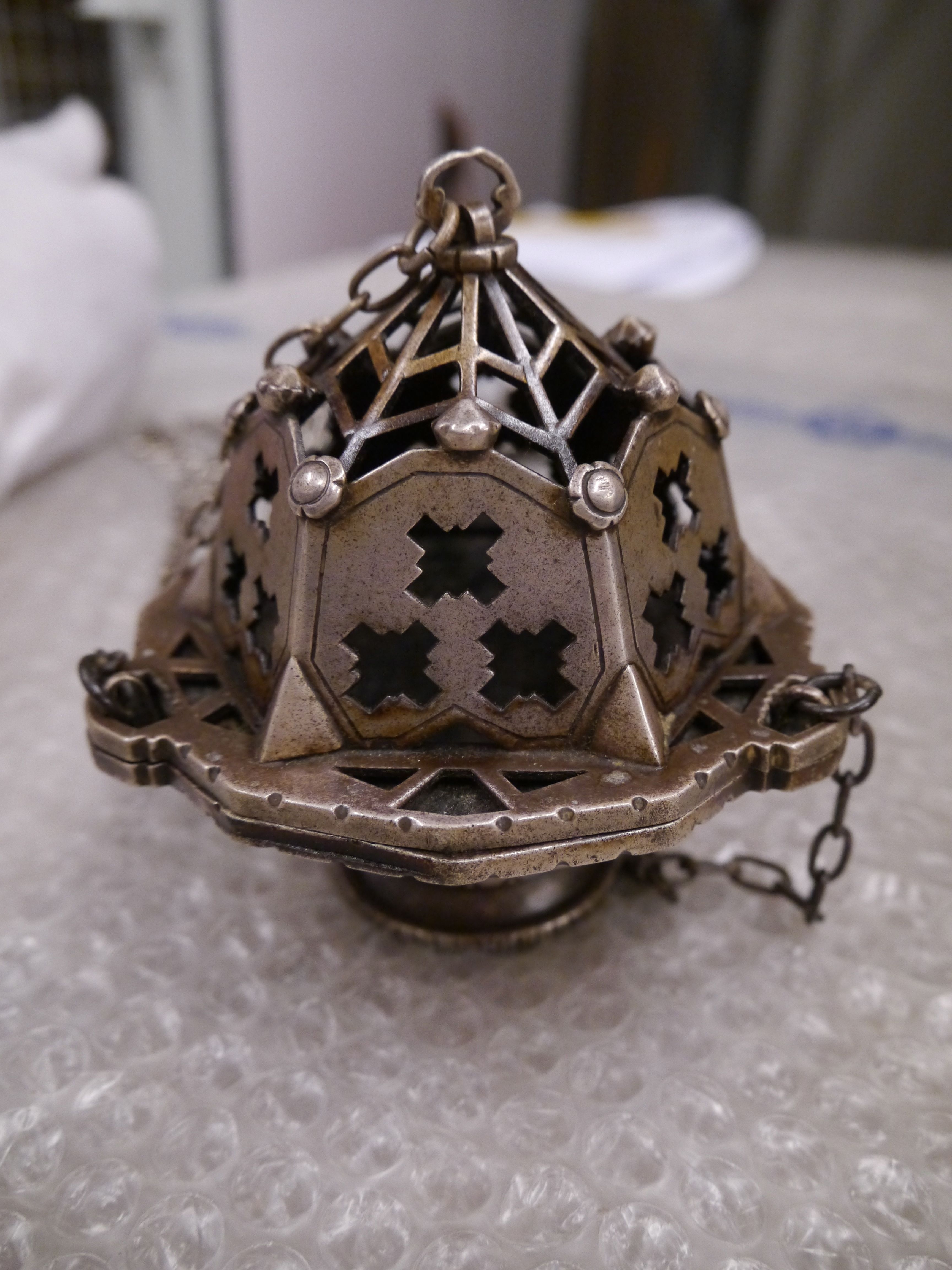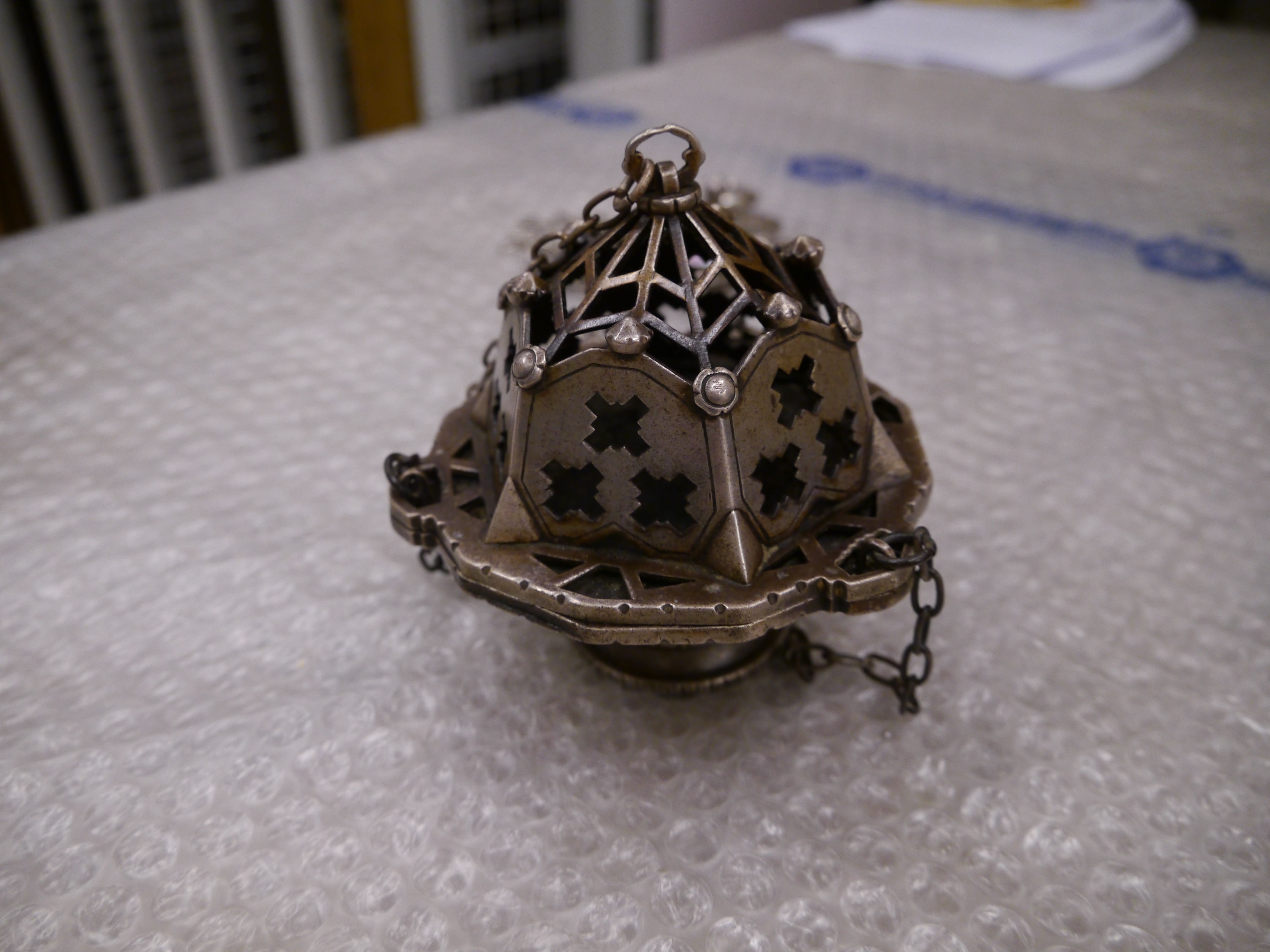 Wierookvat met het wapen van de Sint Paulusabdij Oosterhout op kettingplaatje en met variaties daarop van uitgespaarde kruisjes en roosjes op deksel