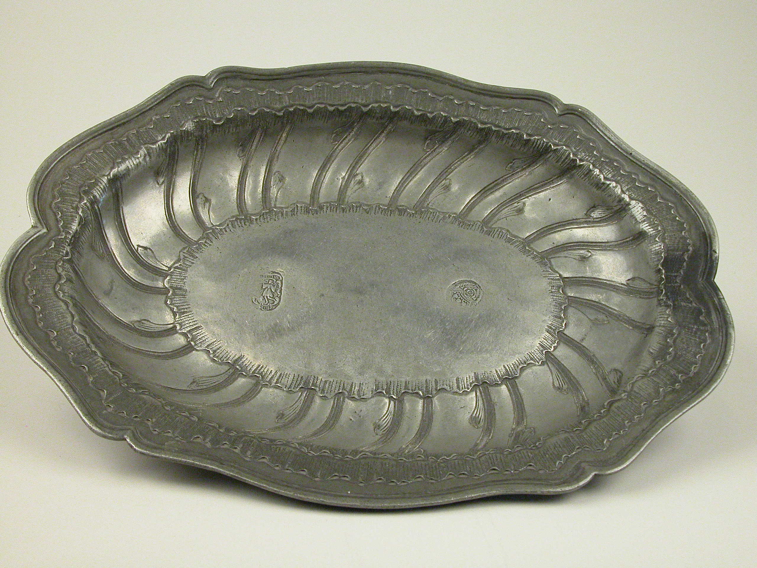 Tinnen ovale gedecoreerde schaal, met keurmerk en meesterteken