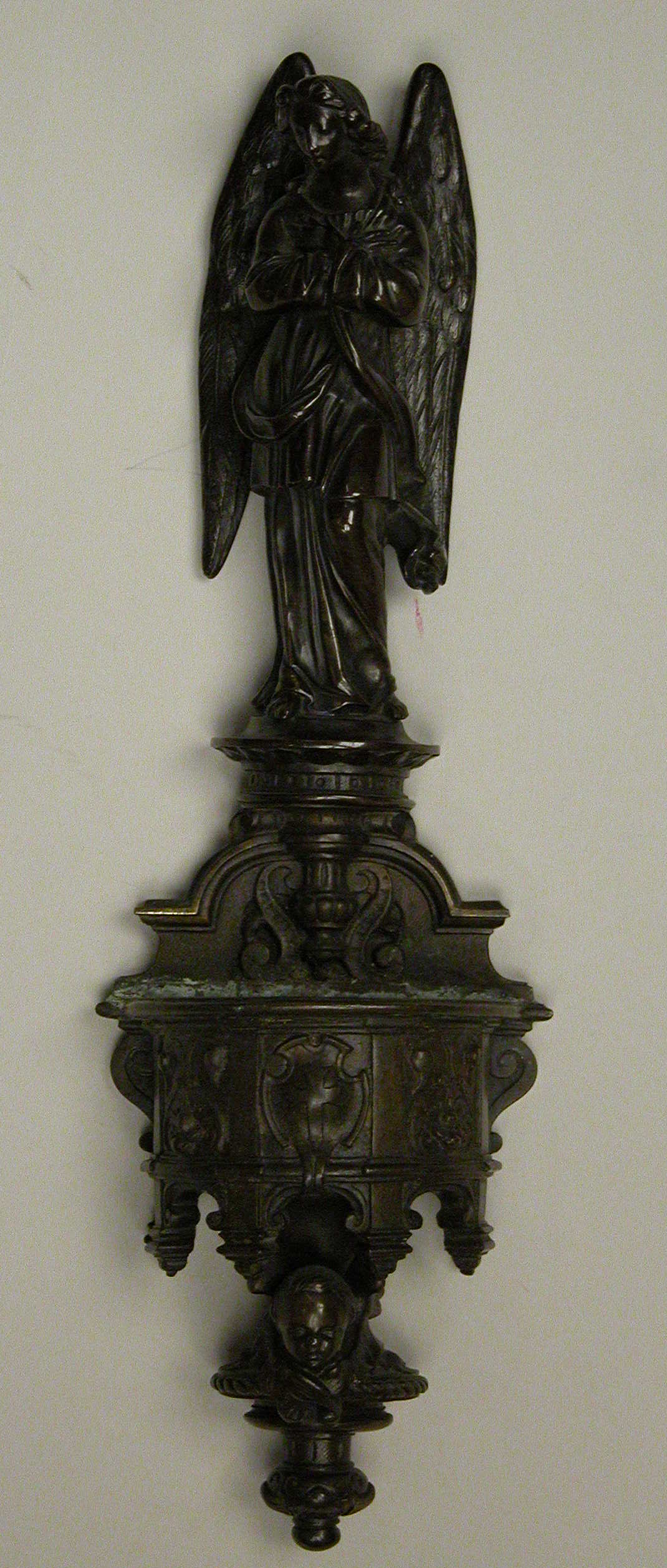 Bronzen wijwaterbakje met engel, bakje royaal gedecoreerd met schildjes en voluten