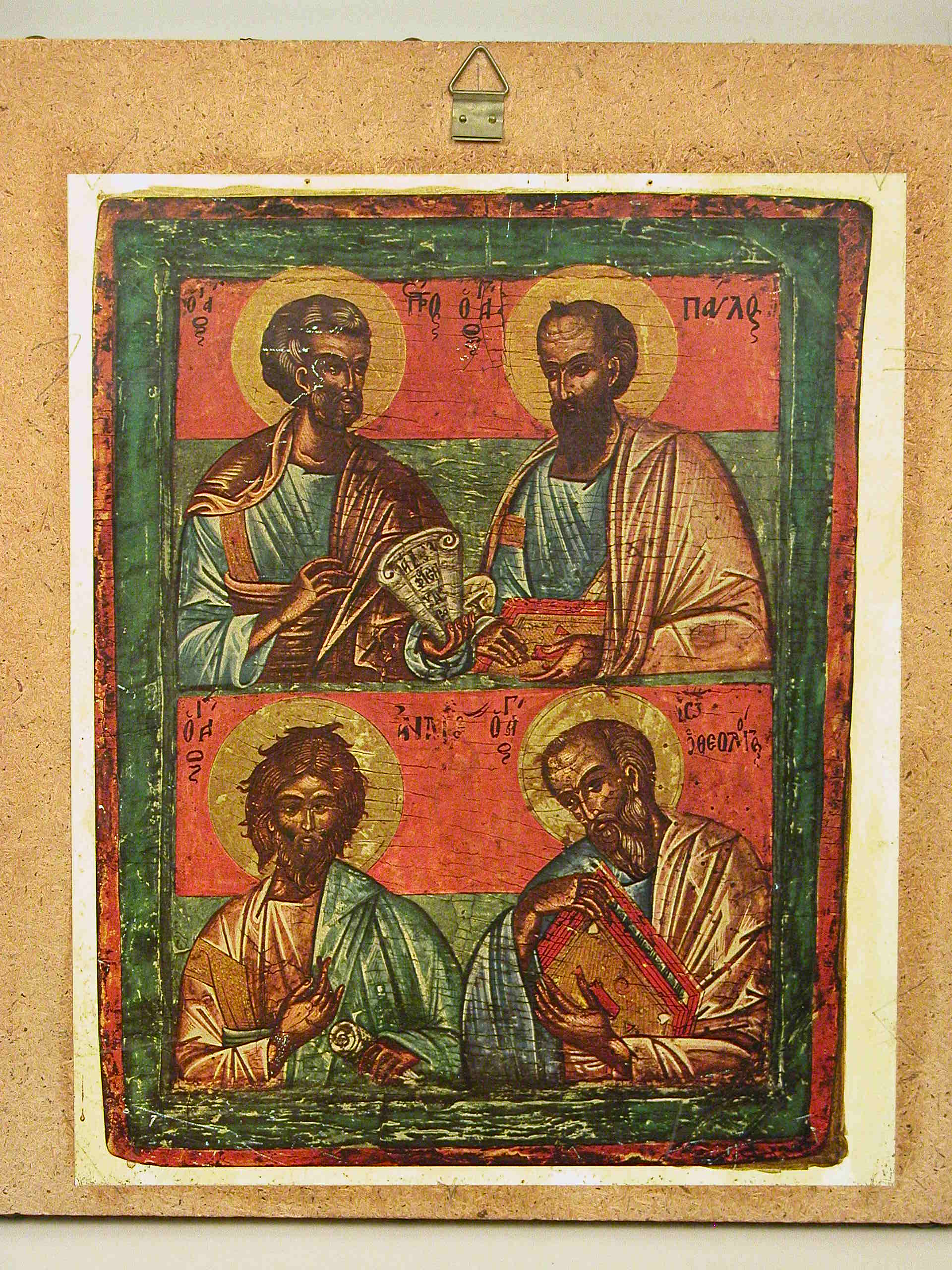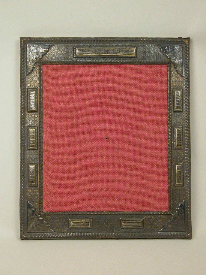 Lijst van verguld zilver, van icoon, met het lofzang 'Benedictus es Domini' in het Russisch, de vier evangelisten in de hoeken
