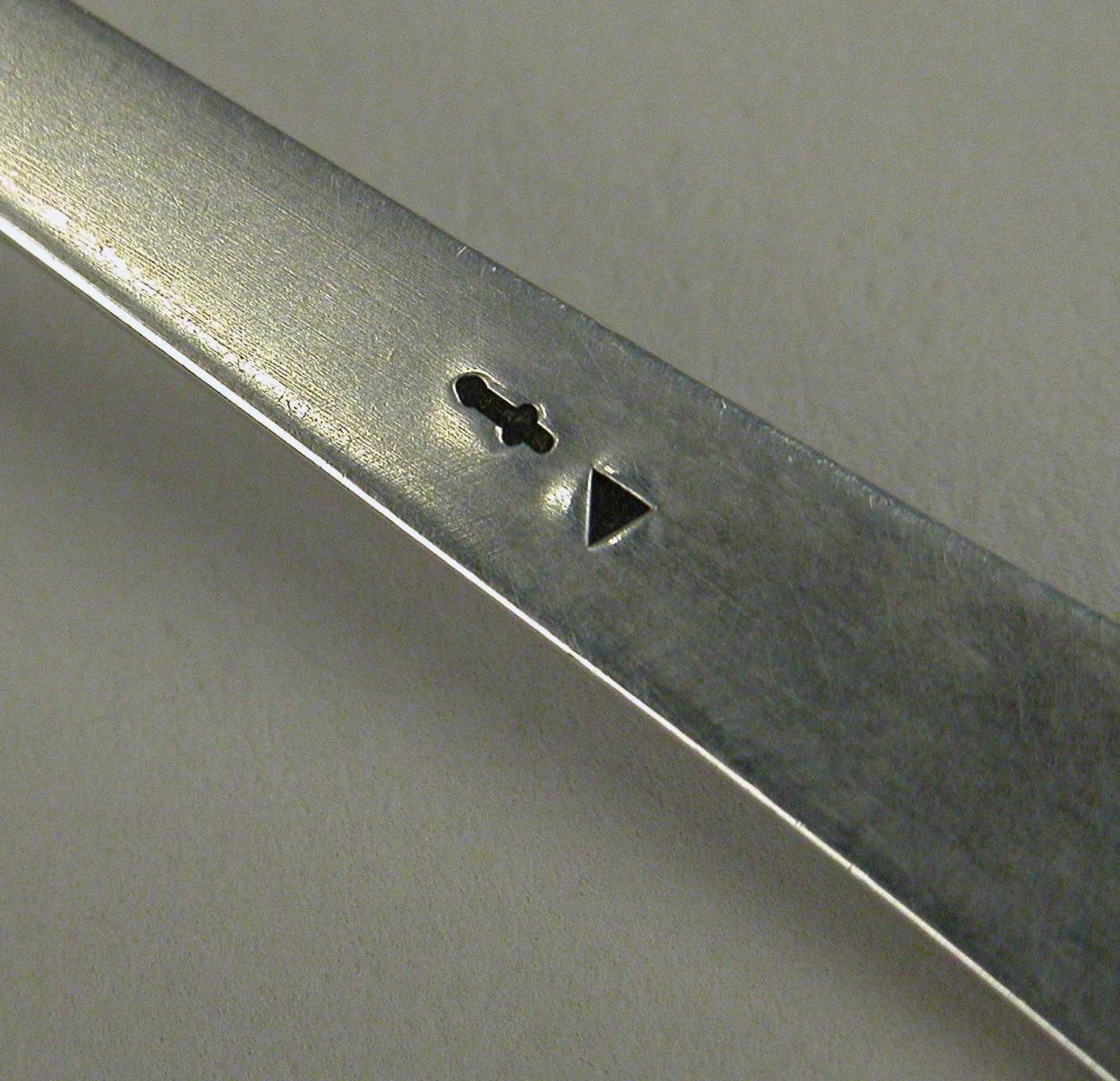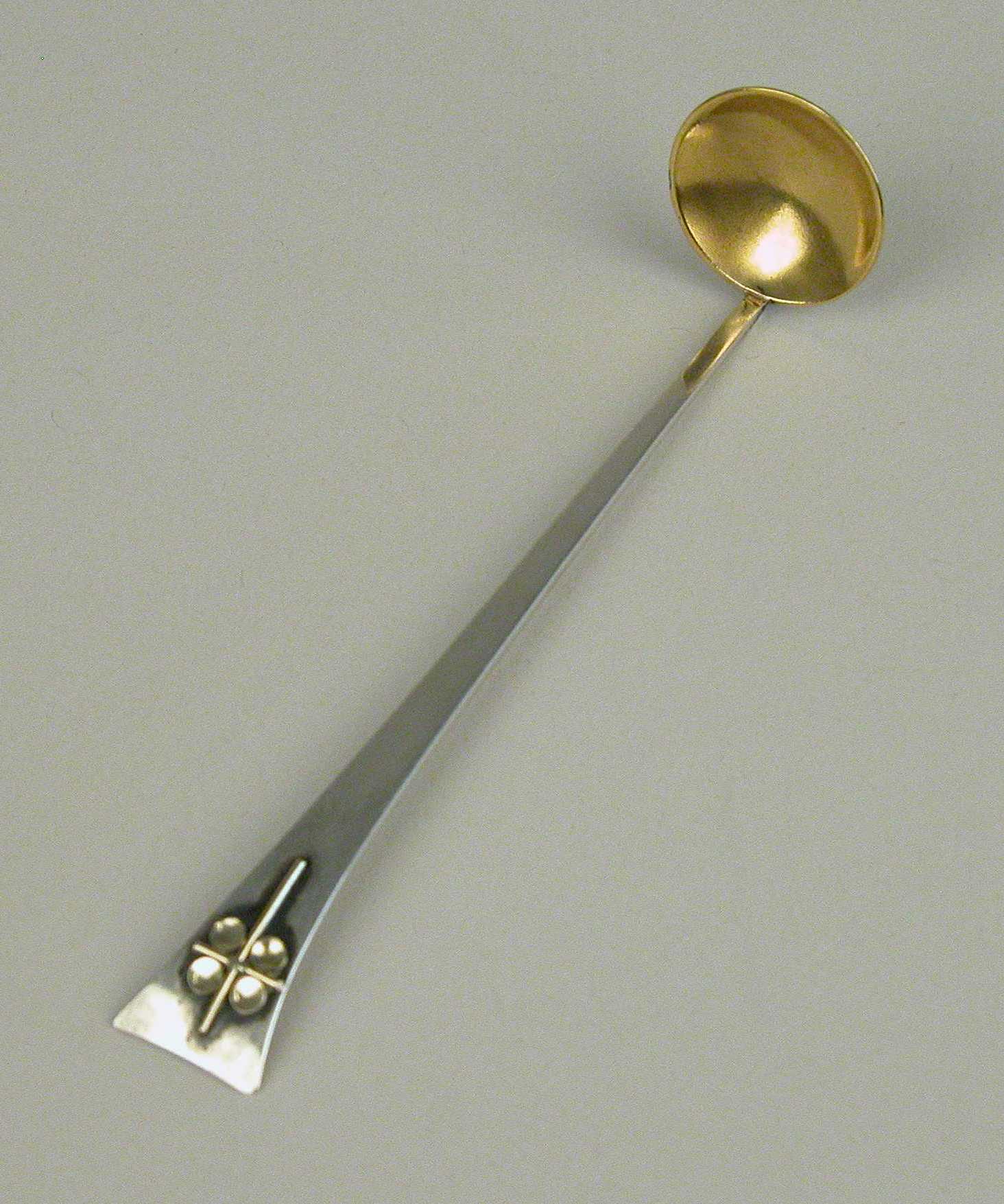 Kelklepeltje met platte wijd uitlopende steel waarop kruisje met vier rondjes