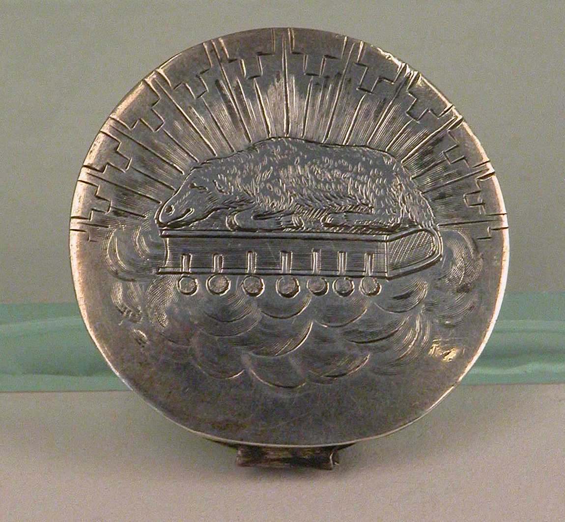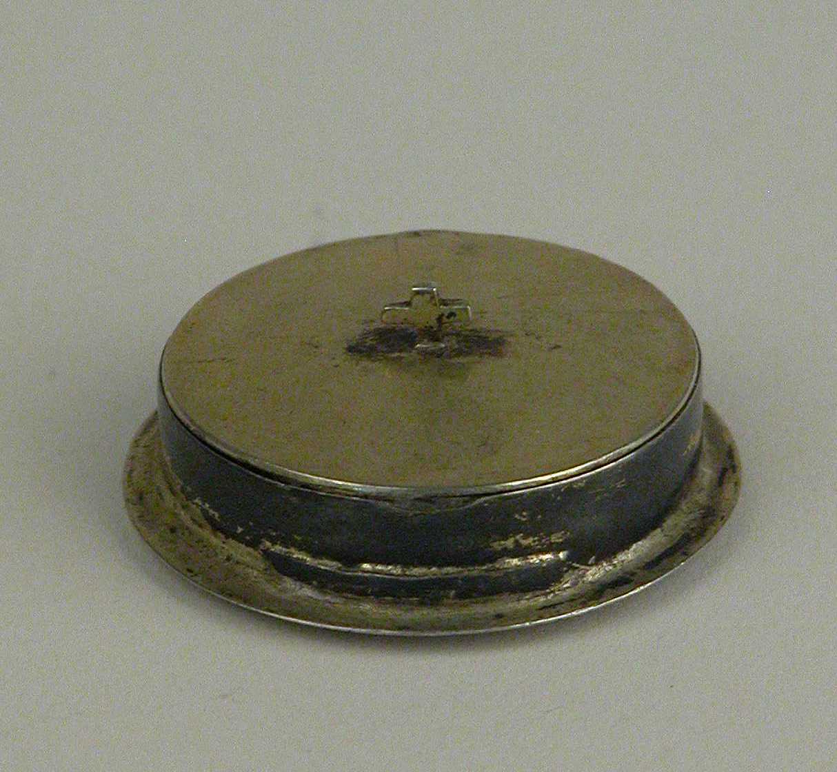 Pyxis met op onderkant gegraveerd Lam Gods op boek met de zeven zegels