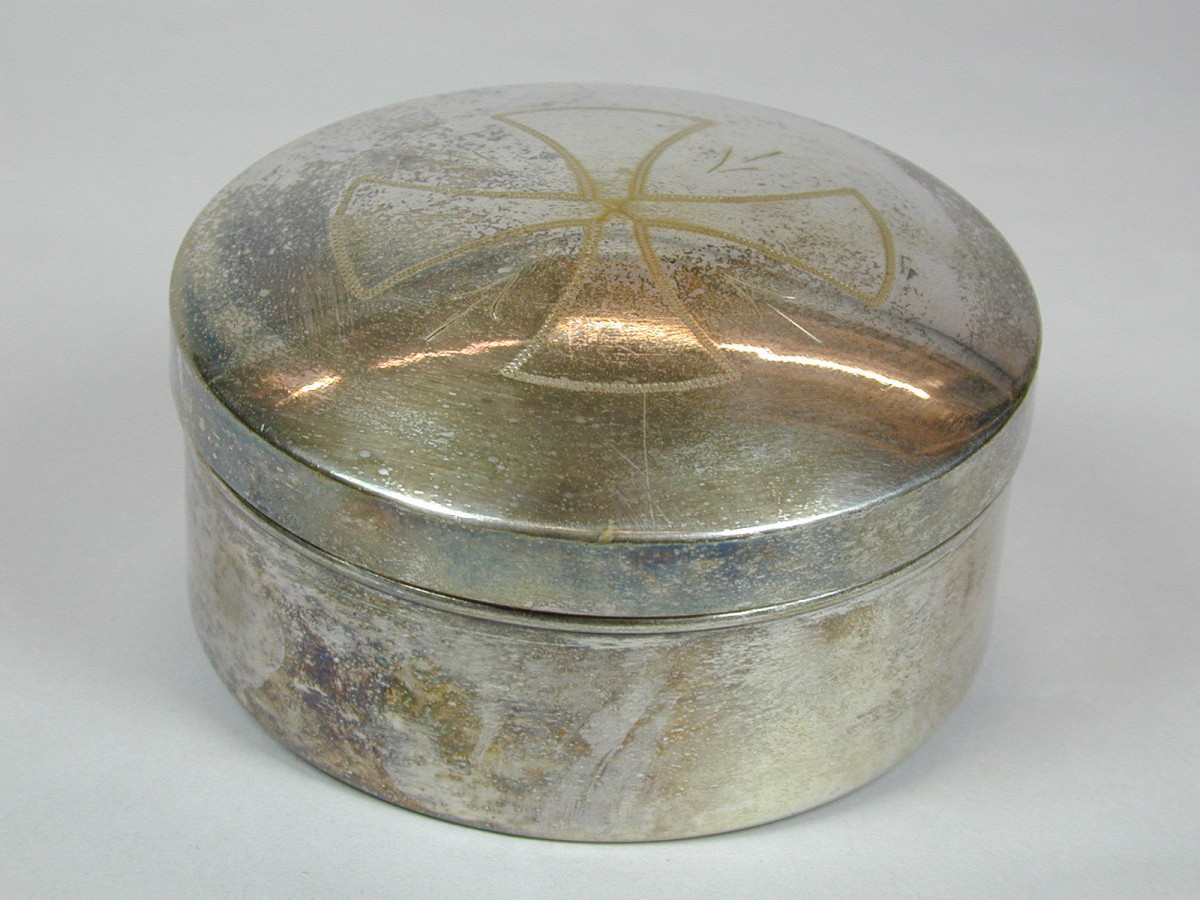 Ronde lunuladoos met kruis en vier pijlen op deksel, met uitneembaar schaaltje