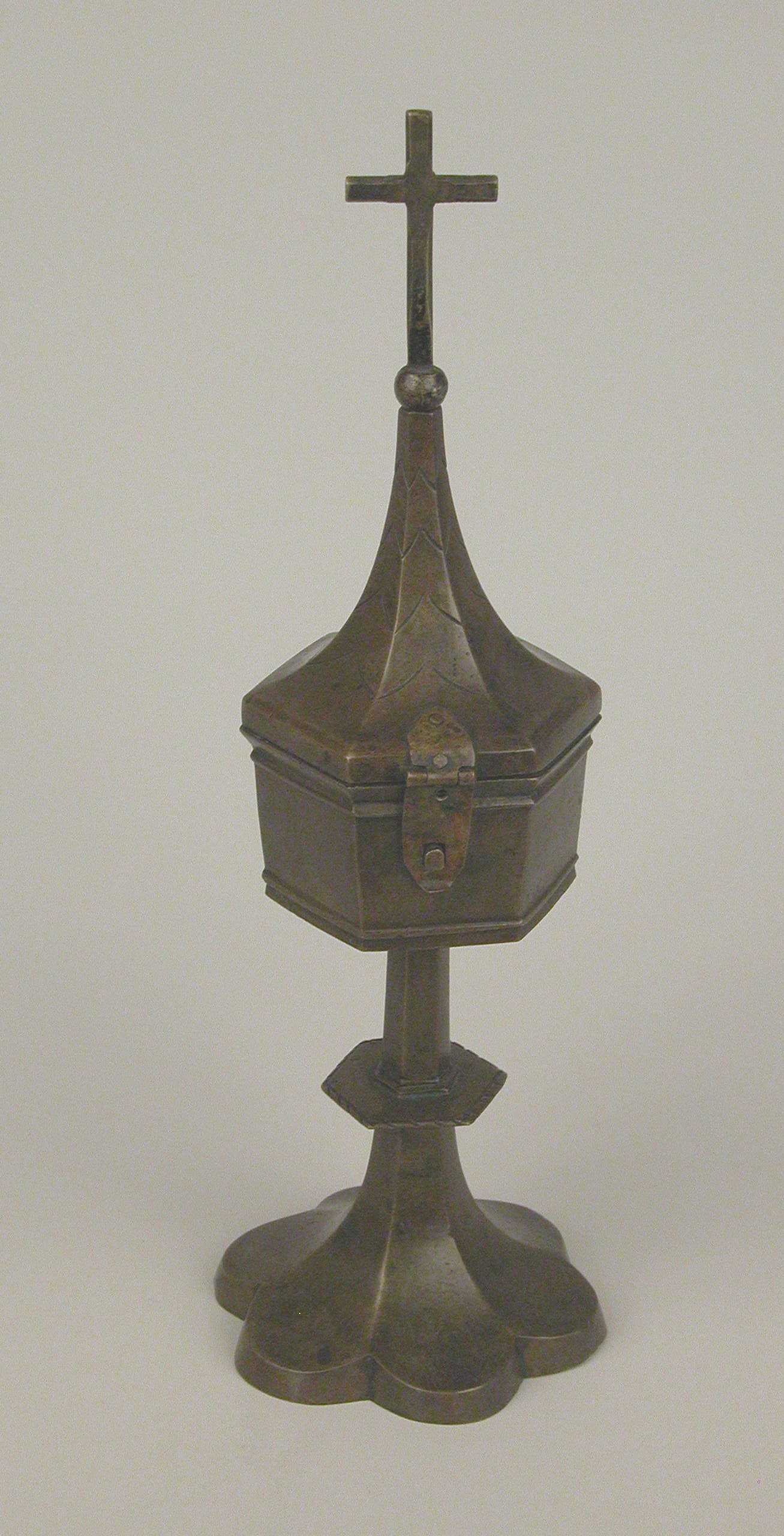 Ciborie met zeslobbige voet, zeshoekige nodus en cuppa, spitstoelopend deksel waarop kruis