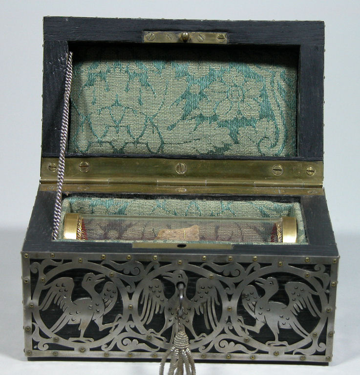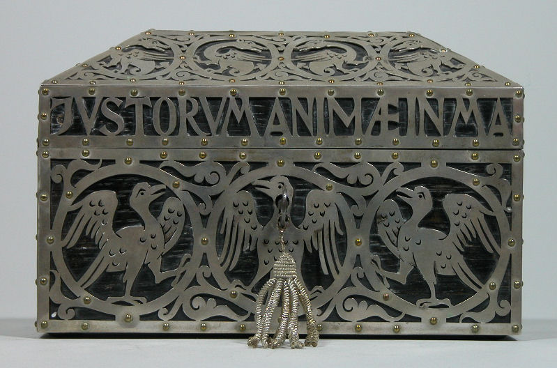 Reliekkist met drie relieken ex oss. Martelaren van Egypte, met opschrift "Justorum Animae in manu Dei sunt & non tanget illos tormentum mortis"