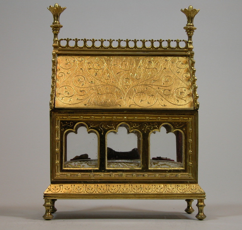 Vergulde reliekkist in gotische stijl met relieken ex oss. H. Erkemboden, H. Bertinus en H. Bavo
