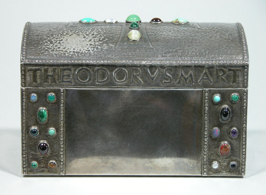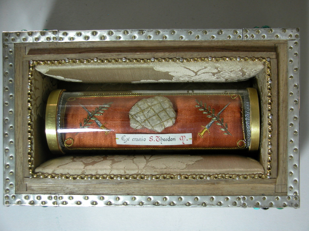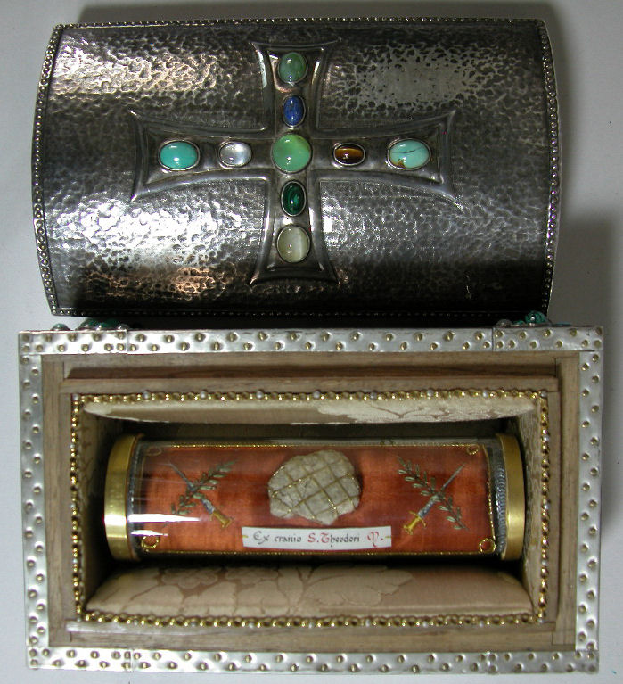 Reliekkist met reliek ex cranio H. Theodorus, op de deksel randschrift "Theodorus mart vicit in Christo"