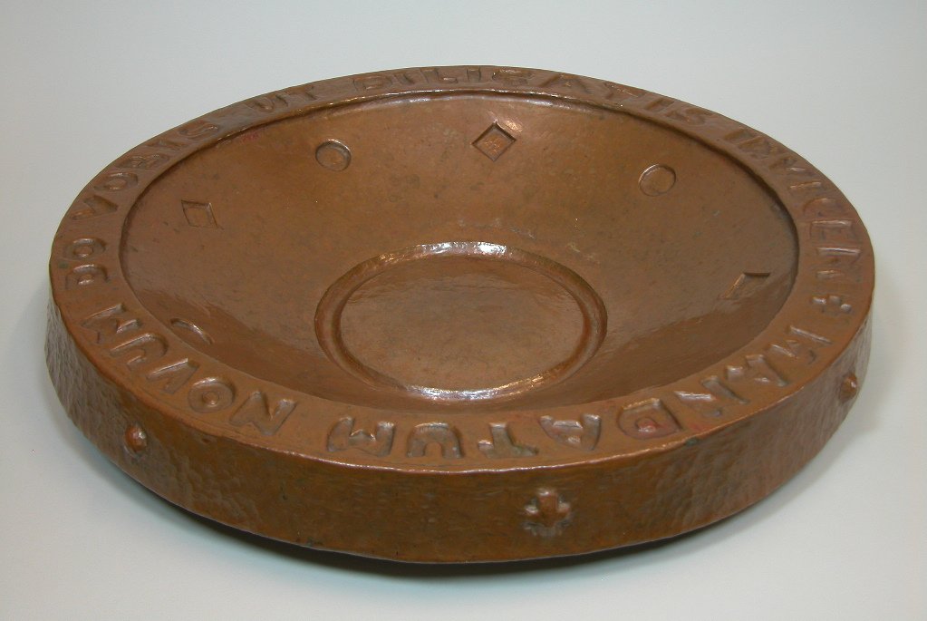 Koperen voetwasbekken met "Mandatum Novum Do Vobis ut Diligatis invicem" (Joh.13:34)
