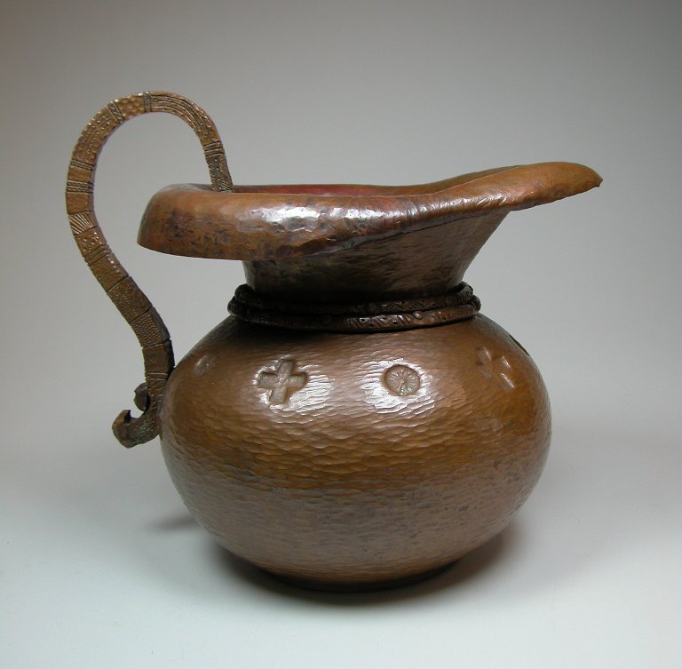 Koperen voetwaskan met handvat versierd met inkepingen