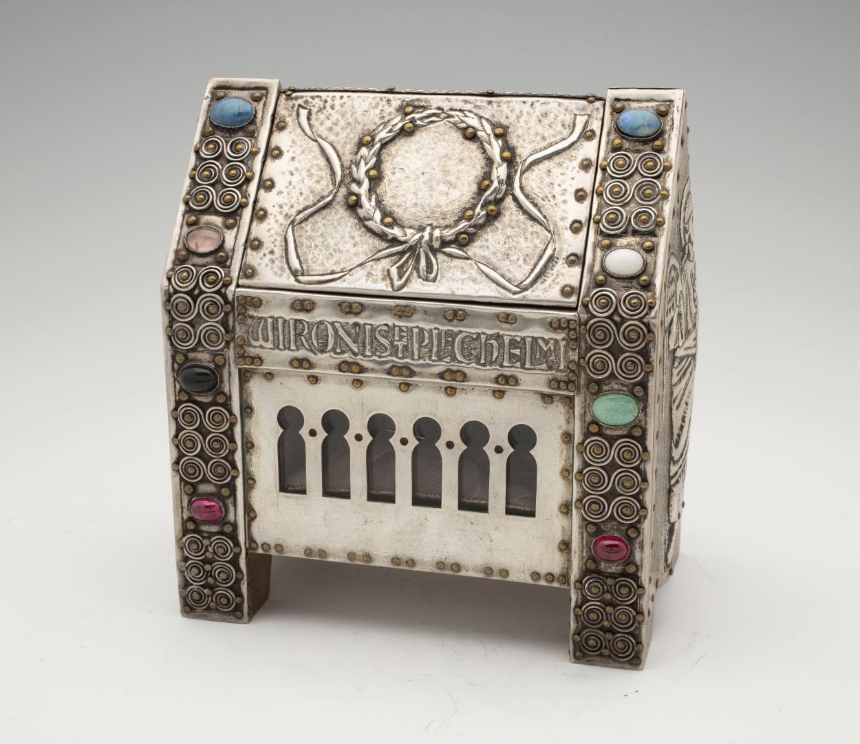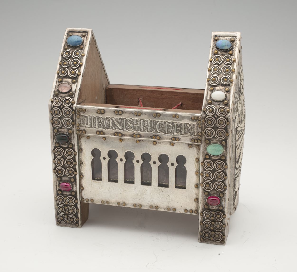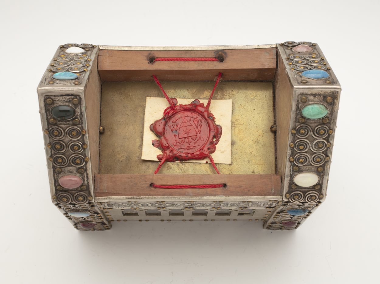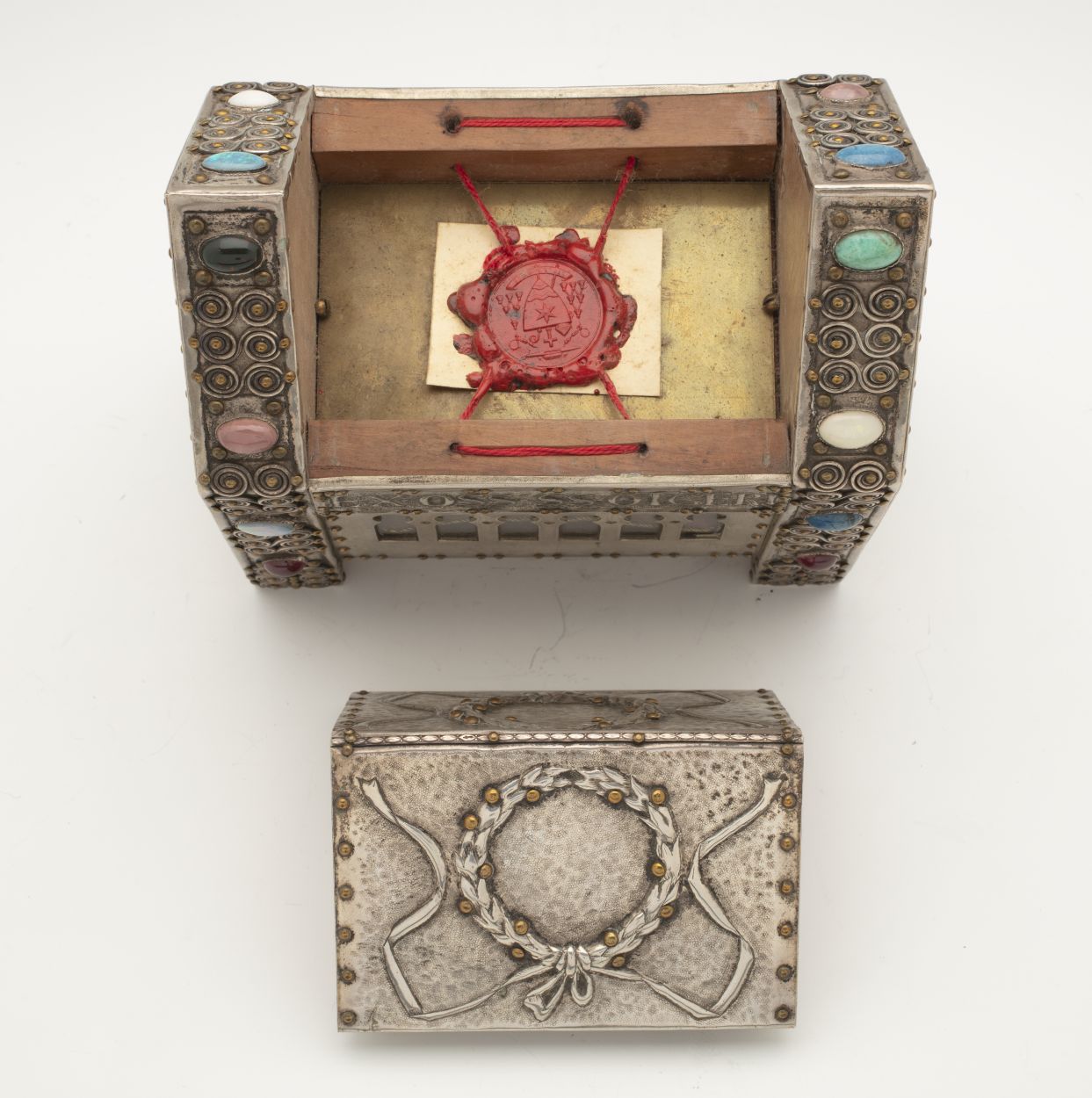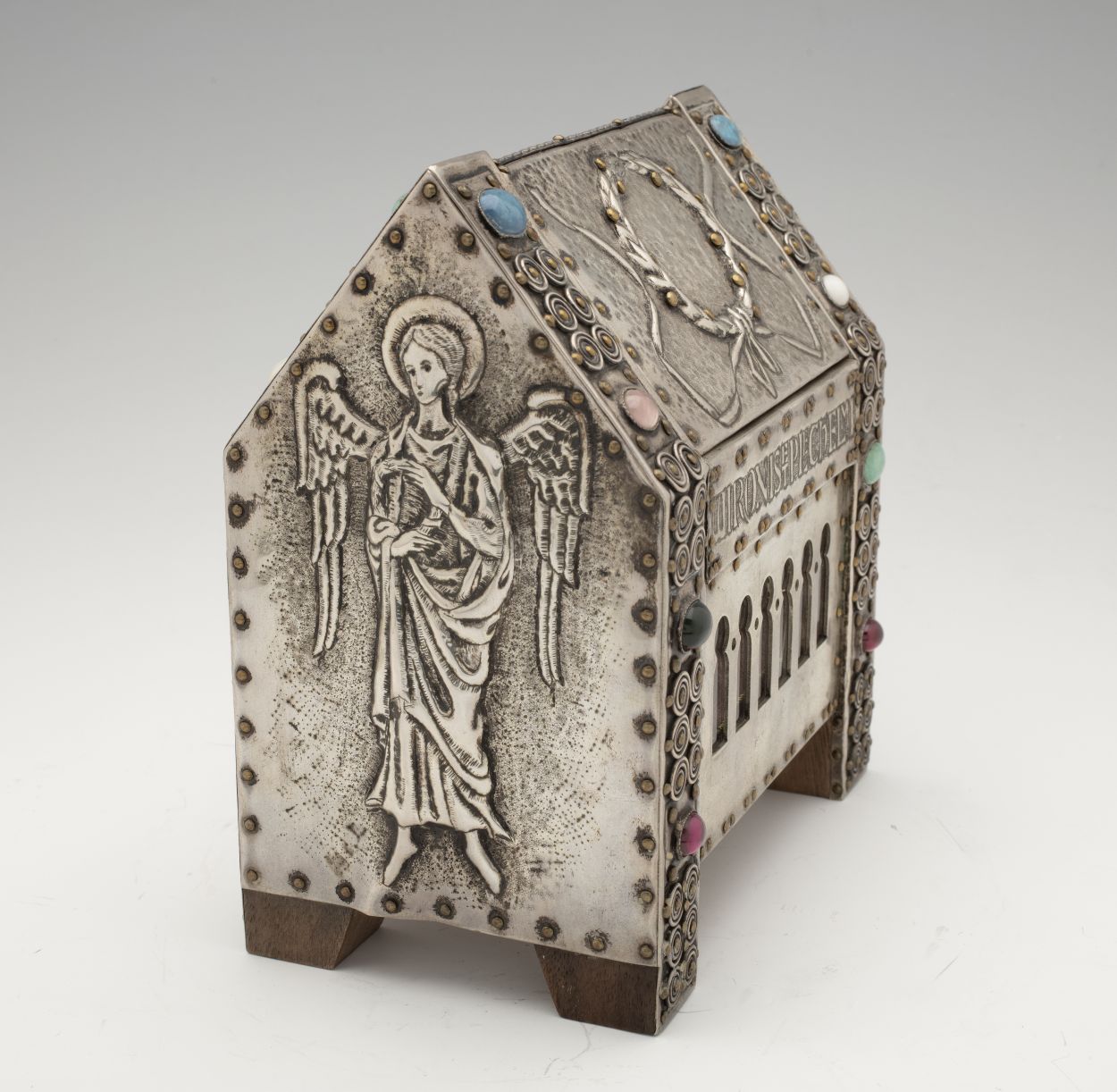 Notenhouten reliekkist met zilverbeslag waarin botrelieken van de H. Otgerus, H. Wiro en H. Plechelmus, met een engel op beide zijkanten en "Ex oss SS Otgeri Wironis et Plechelmi"