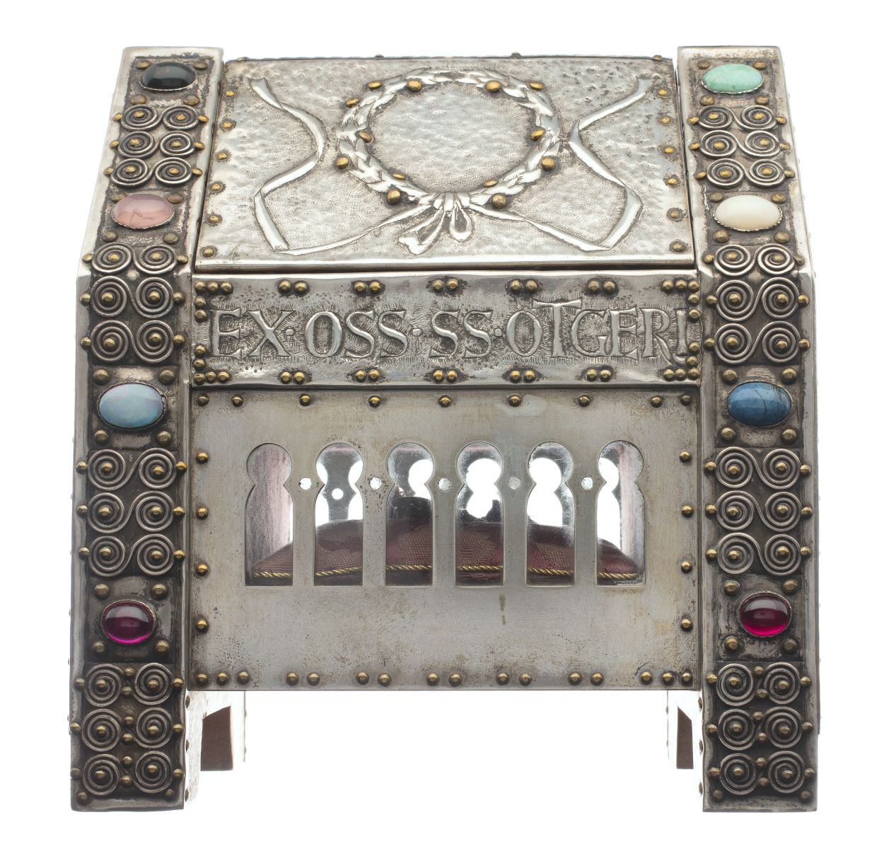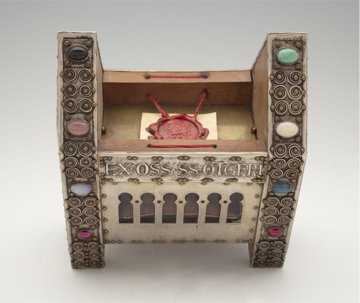 Notenhouten reliekkist met zilverbeslag waarin botrelieken van de H. Otgerus, H. Wiro en H. Plechelmus, met een engel op beide zijkanten en "Ex oss SS Otgeri Wironis et Plechelmi" op voor- en achterzijde en met lauwerkrans op beide zijden van het zadeldak. De kist is versierd met zestien halve edelstenen: vier synthetische robijnen, twee opaal ...