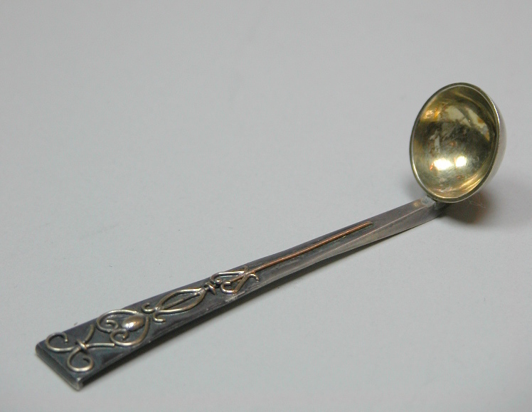 Kelklepeltje met platte wijd uitlopende steel met krulmotieven
