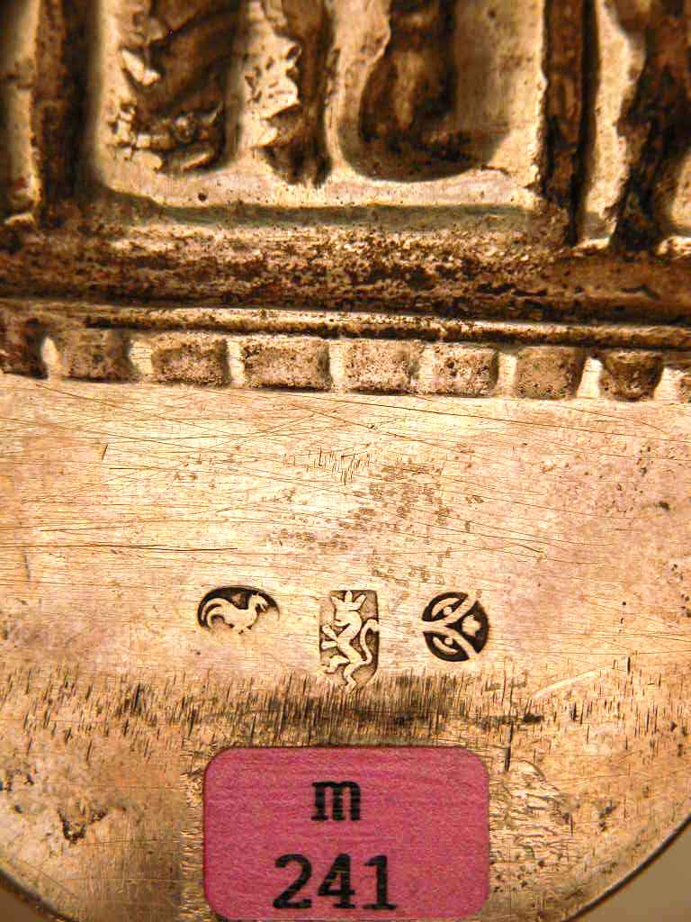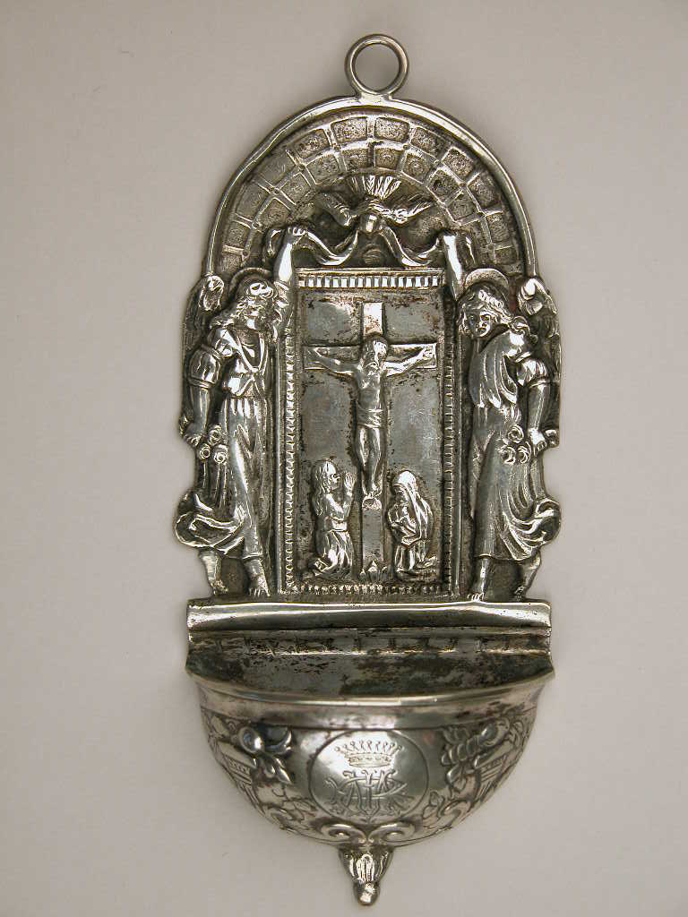 Wijwaterbakje met kruisiging in een poort geflankeerd door engelen, bekroond met duif